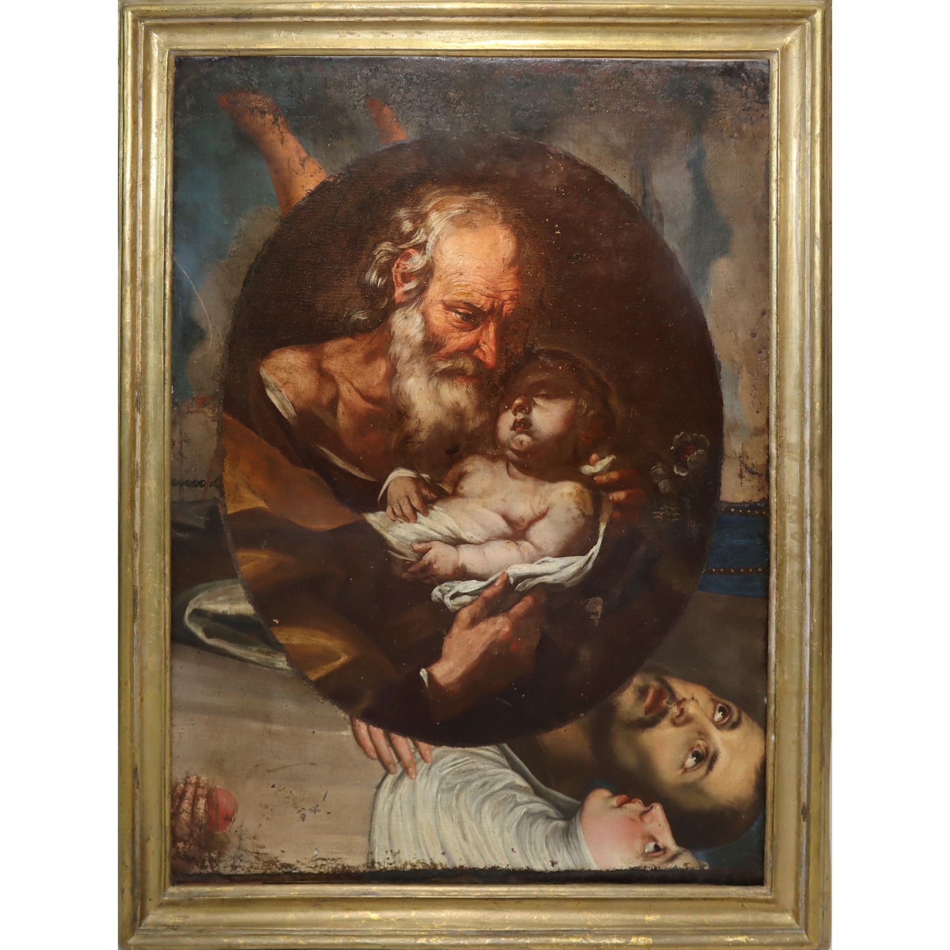 S.Giuseppe con Bambino, 17° secolo paintercm 100 x 73, in cornice cm 116 x 88Olio su tela.Opera ricavata dalla pulitura du due dipinti sovrapposti. Si può fare il paragone con le tele di Ercole de Maria detto anche Ercolino di Guido o Ercolino di Bologna di Palazzo Arcivescovile di Milano e di Houston pubblicate da Pepper.