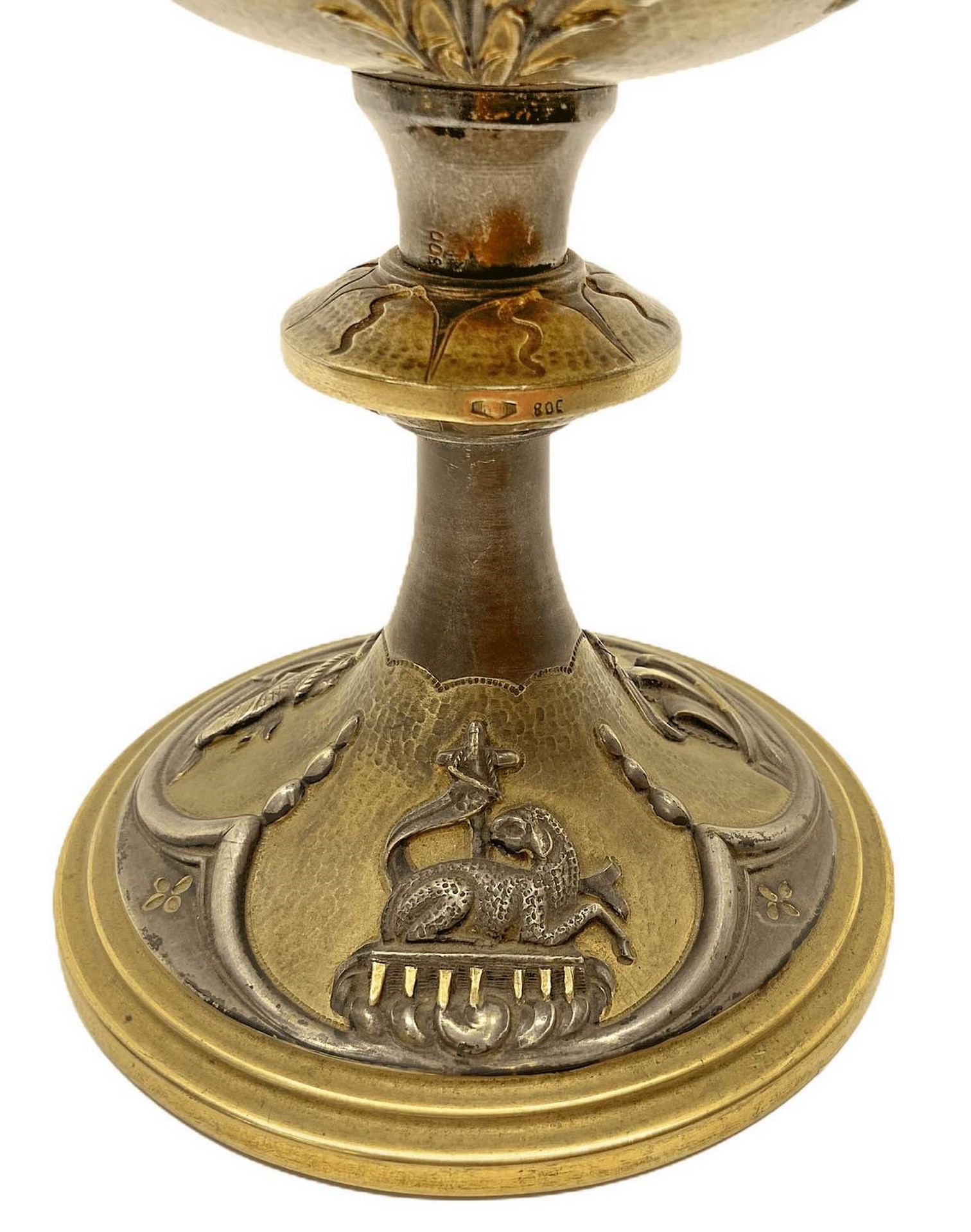 Calice con patena in argento vermeil decorato a sbalzo con motivi floreali, primi XX secoli. Sulla base simboli religiosi. H cm 15 . Gr 490 . Con custodia originale., Primi 20° secolo H cm 15. Gr 490 .Decorato a sbalzo con motivi floreali, sulla base simboli religiosi. Con custodia originale.Decorato a sbalzo con motivi floreali, sulla base simboli religiosi. Con custodia originale.