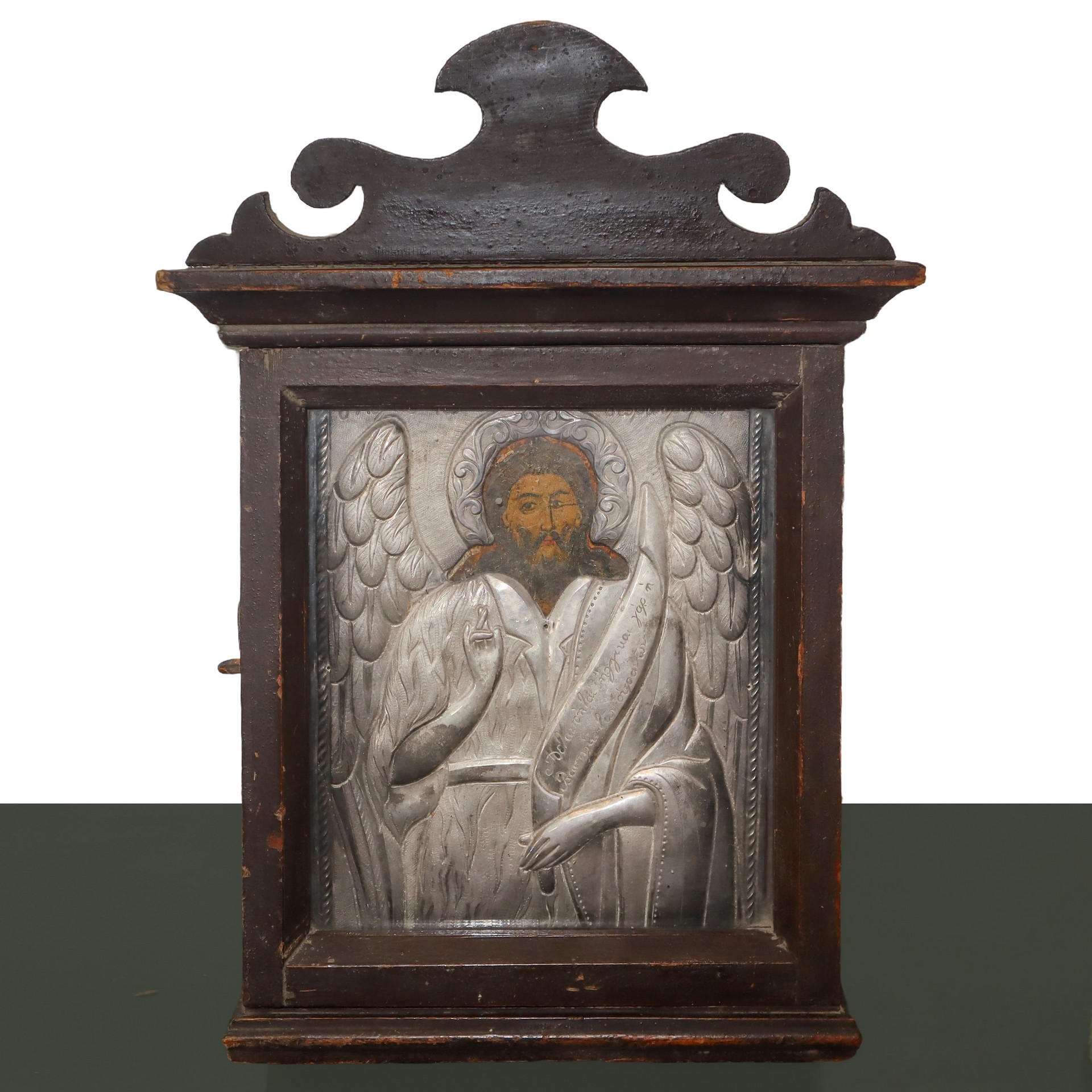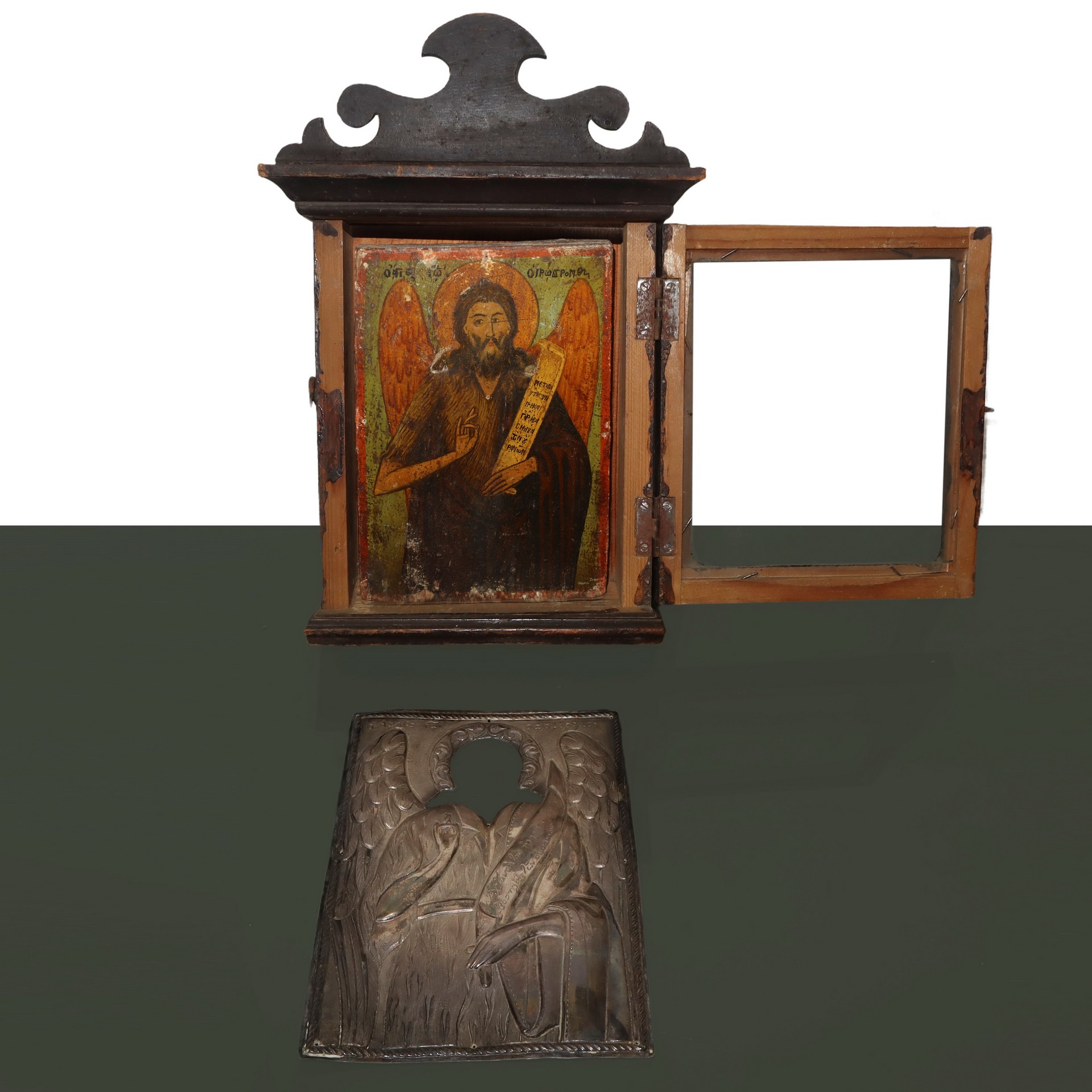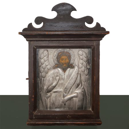 Icona greca raffigurante Cristo Pantocratorecm 20x14 in teca di legno cm 32,5x19,5 profondita cm 7Con riza in argento in legno dipinto a temperaCon riza in argento in legno dipinto a tempera