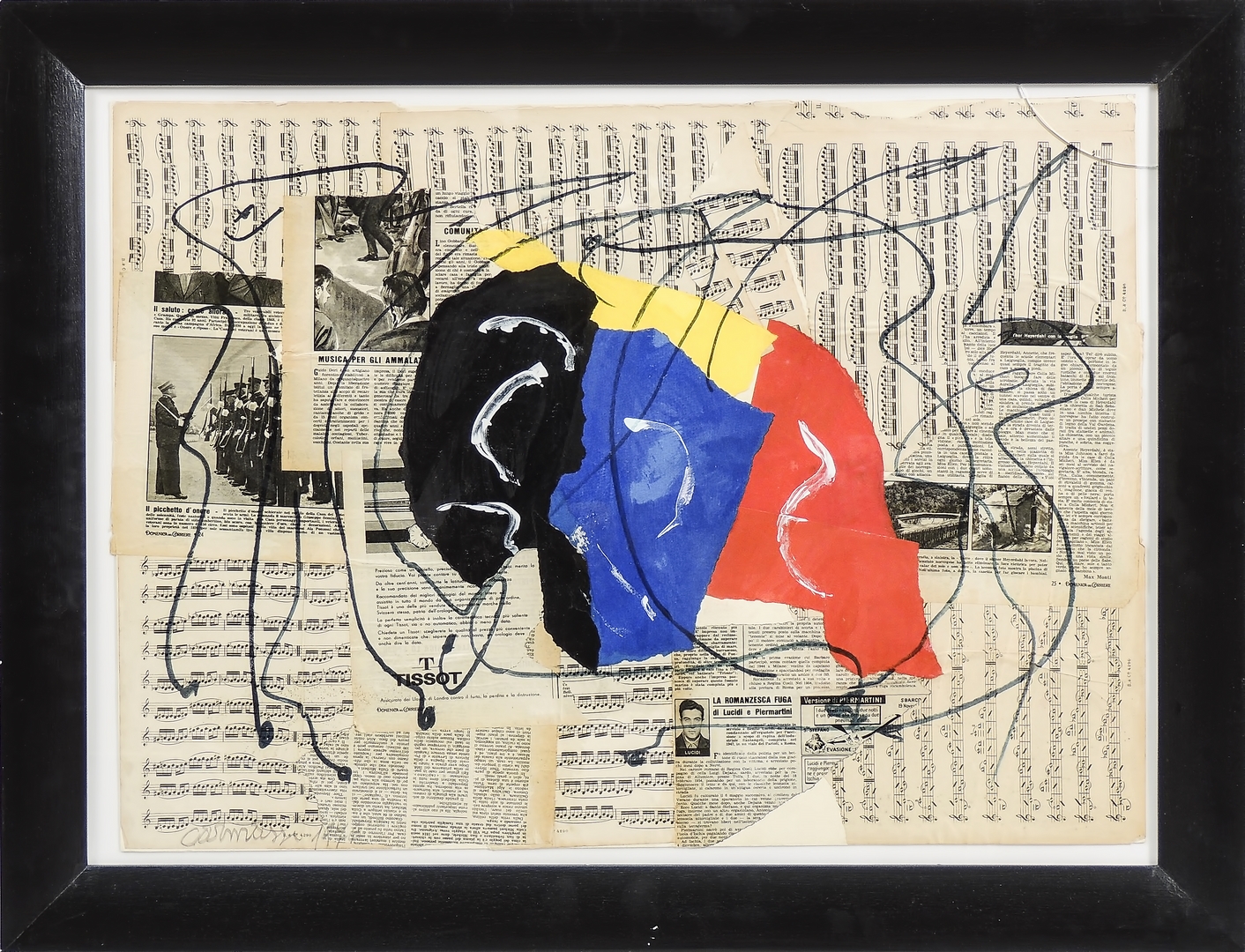 ARTURO CARMASSI Composizione con spartiti musicali - Composition with Sheets Music tecnica mista e collage - mixed media and collage, firmato e datato 1976, in cornice cm 52x71 Corredato di autentica dell'autore su fotografia - with Author's authentication on photo