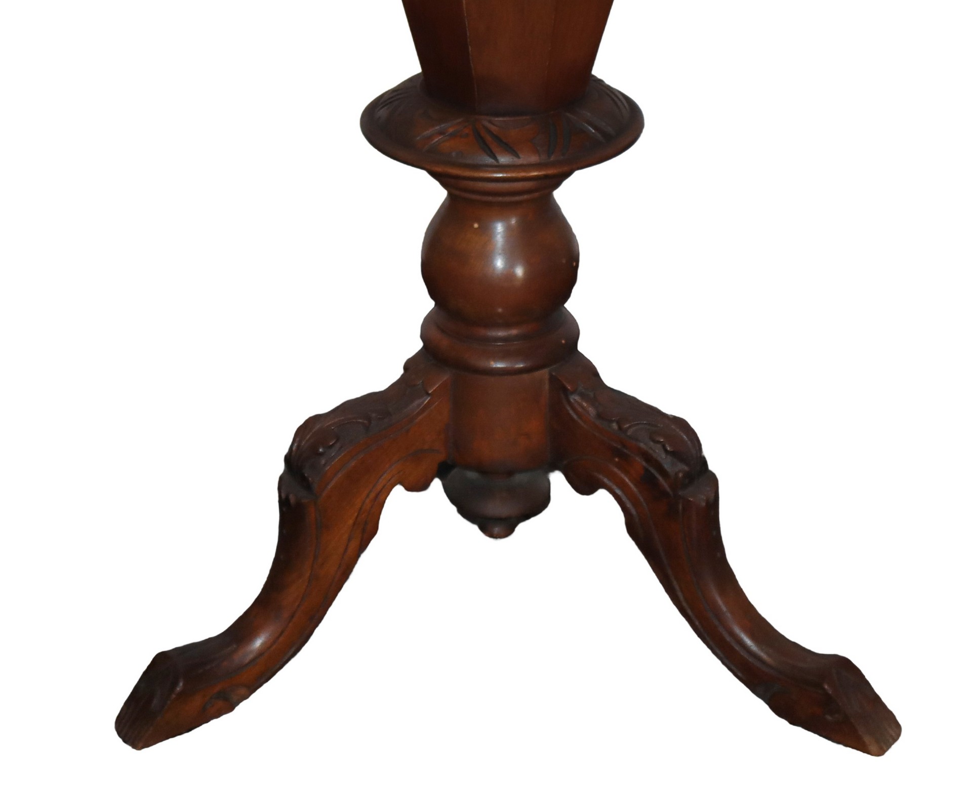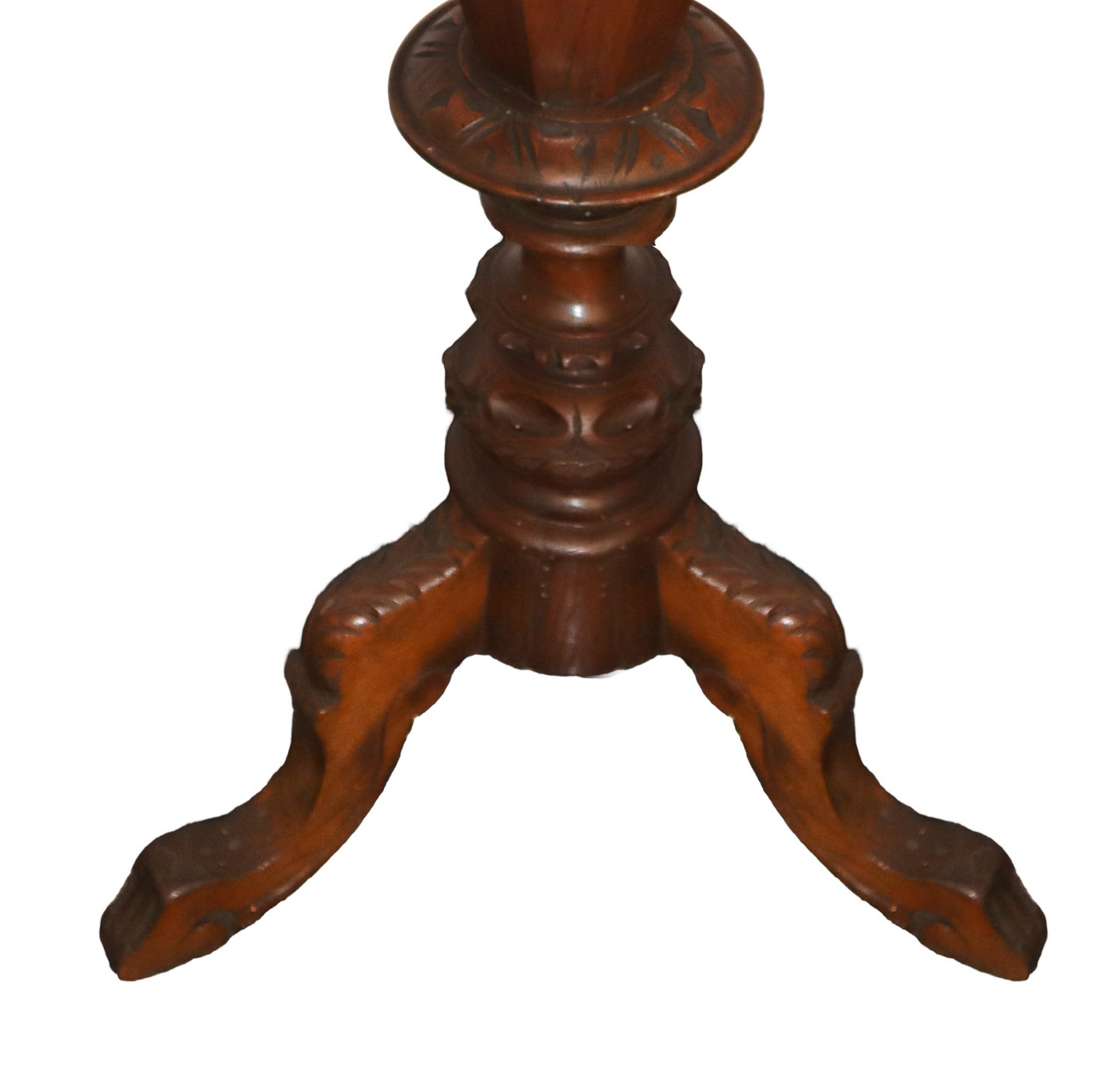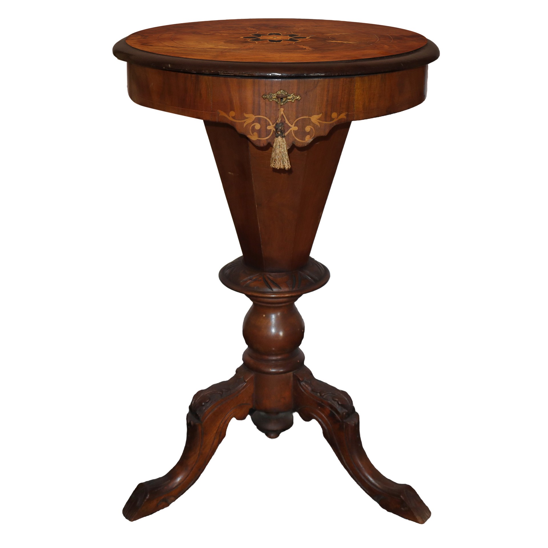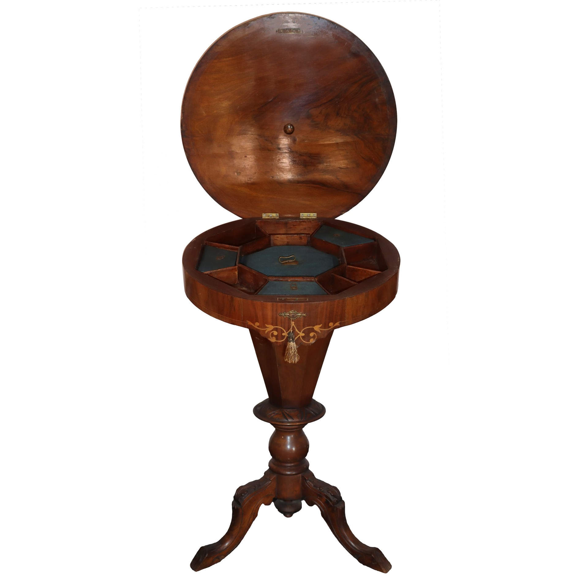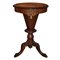 Tavolino da lavoro rotondoCon intarsi al piano e sulla balza in legni chiari, piede a tre razzeCon intarsi al piano e sulla balza in legni chiari, piede a tre razze