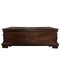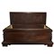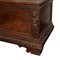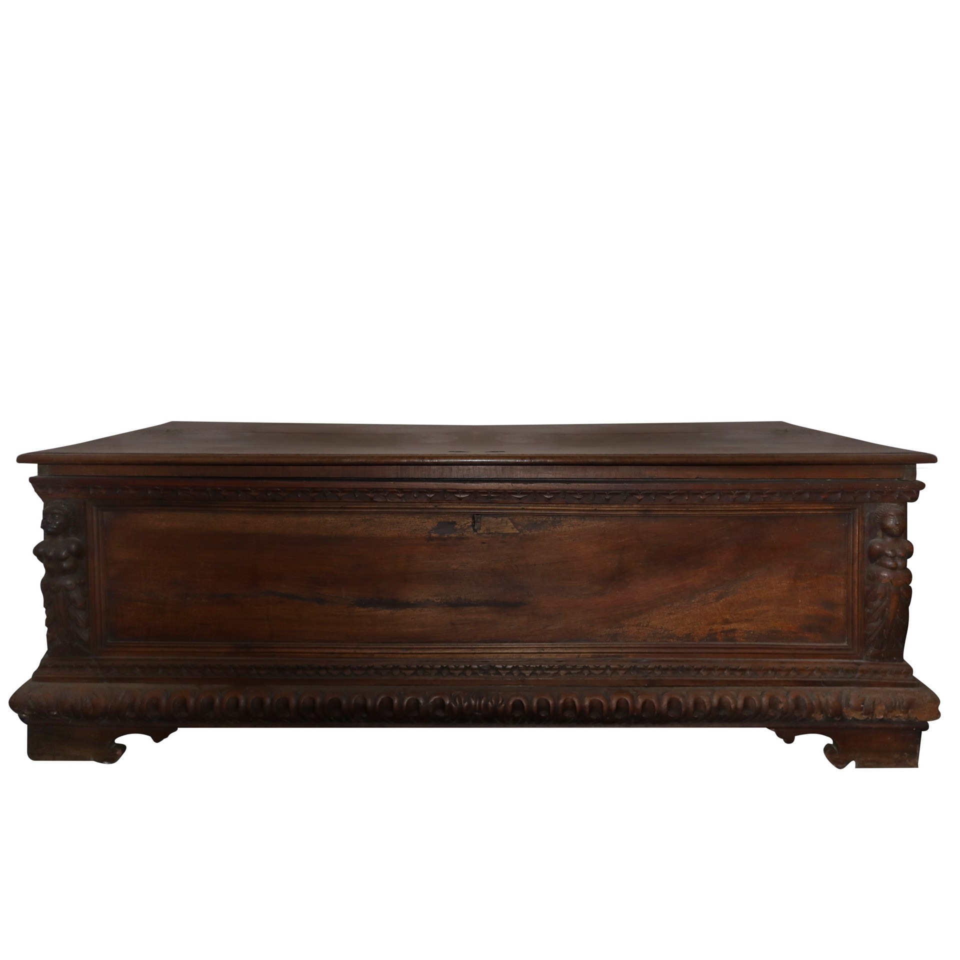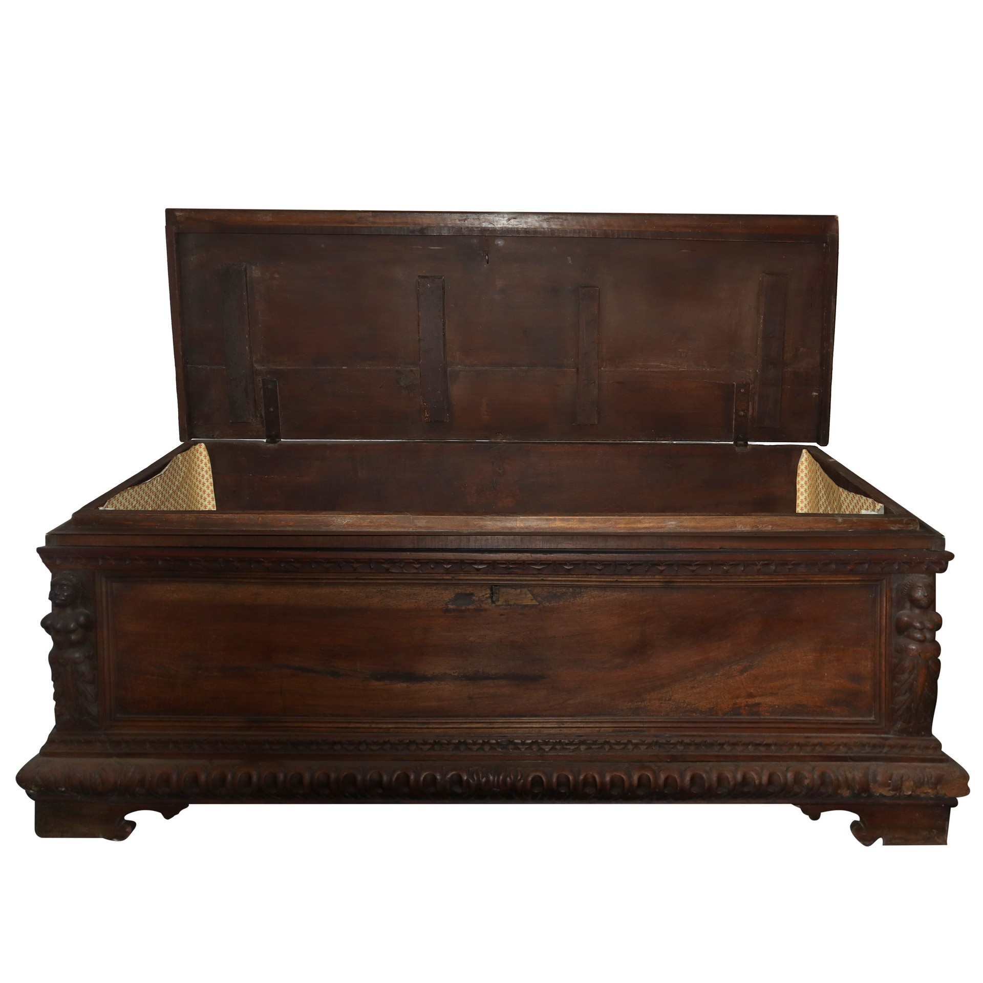 Cassapanca in legno di noce, 18° secolo Ai lati cariatidi e alla base grande cornice in diversi ordini di sculturaAi lati cariatidi e alla base grande cornice in diversi ordini di scultura