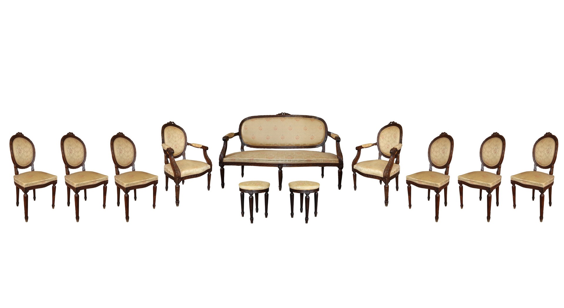 Salotto con braccioli intagliati a foglie d'acanto, gambe scanaTardo, tappezzaria damascata in stile floreale, Primi 20° secolo Divano H cm 96x140x50, poltrone H cm 94x62x48, sedie h 96 x 40 x40, sgabelli h 46 x 37 Composto da divano, due poltrone, sei sedie e due sgabelli Composto da divano, due poltrone, sei sedie e due sgabelli