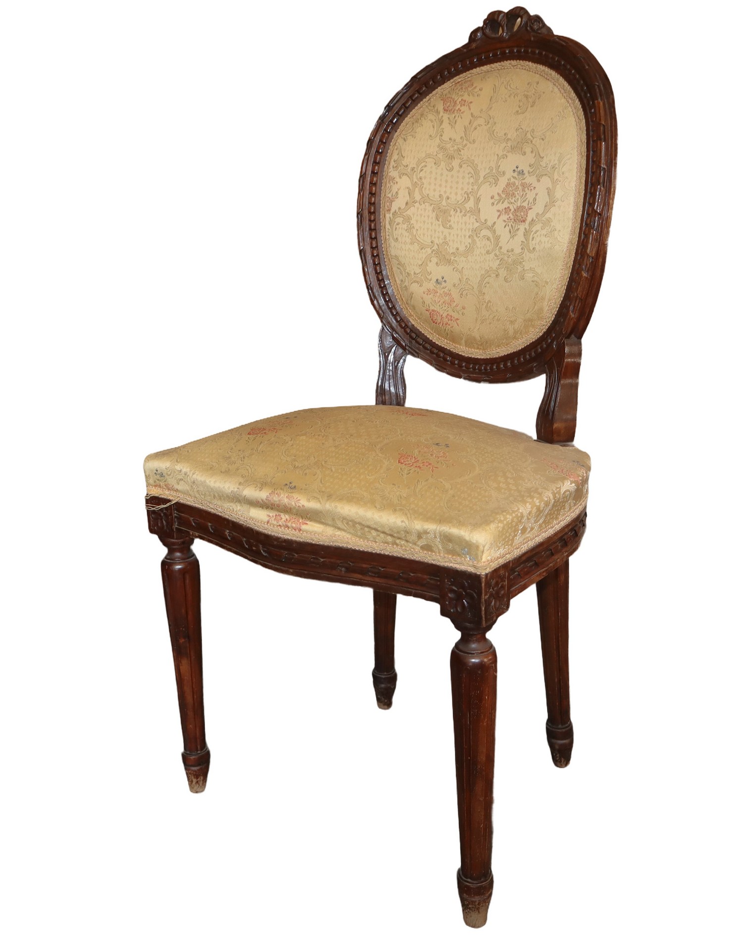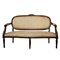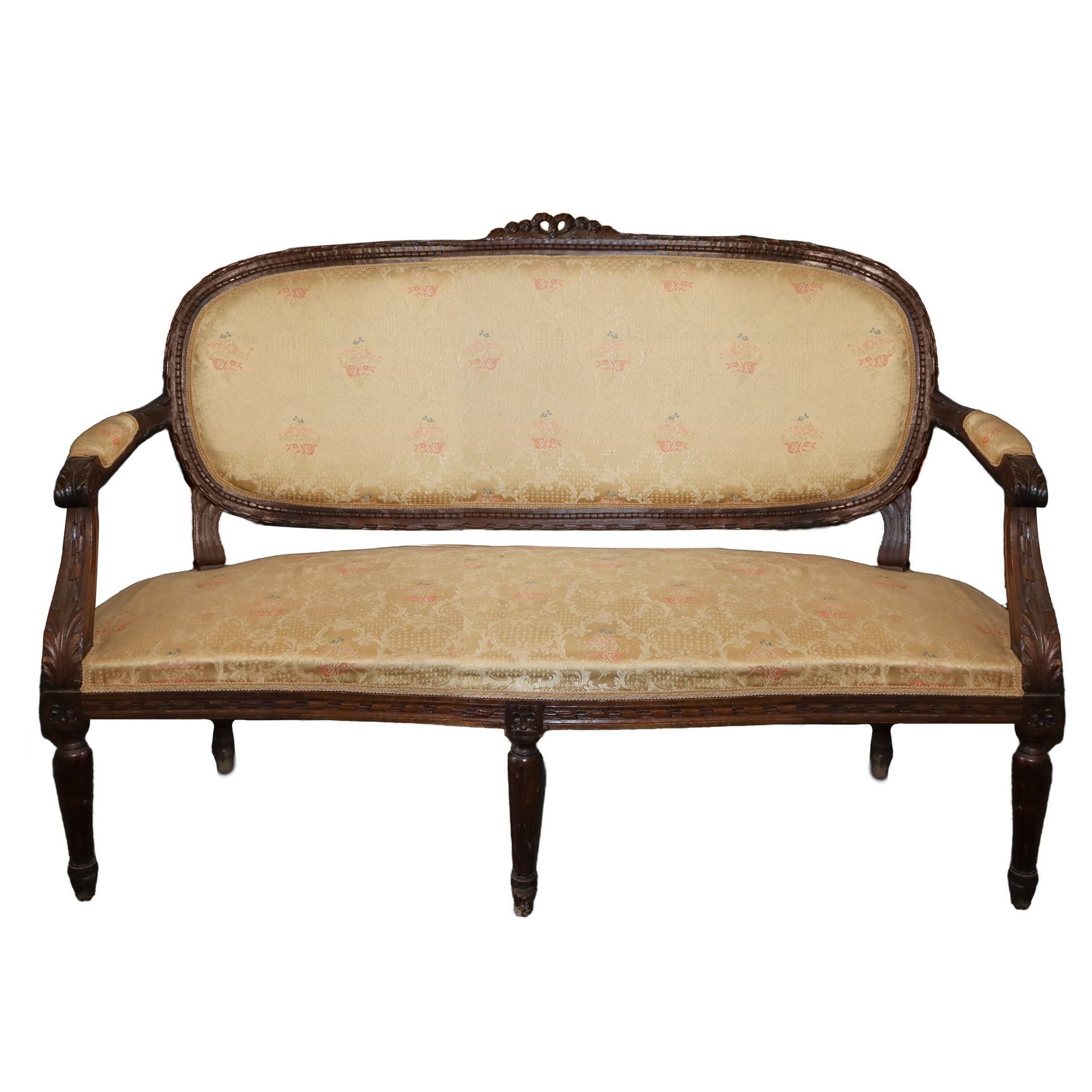 Salotto con braccioli intagliati a foglie d'acanto, gambe scanaTardo, tappezzaria damascata in stile floreale, Primi 20° secolo