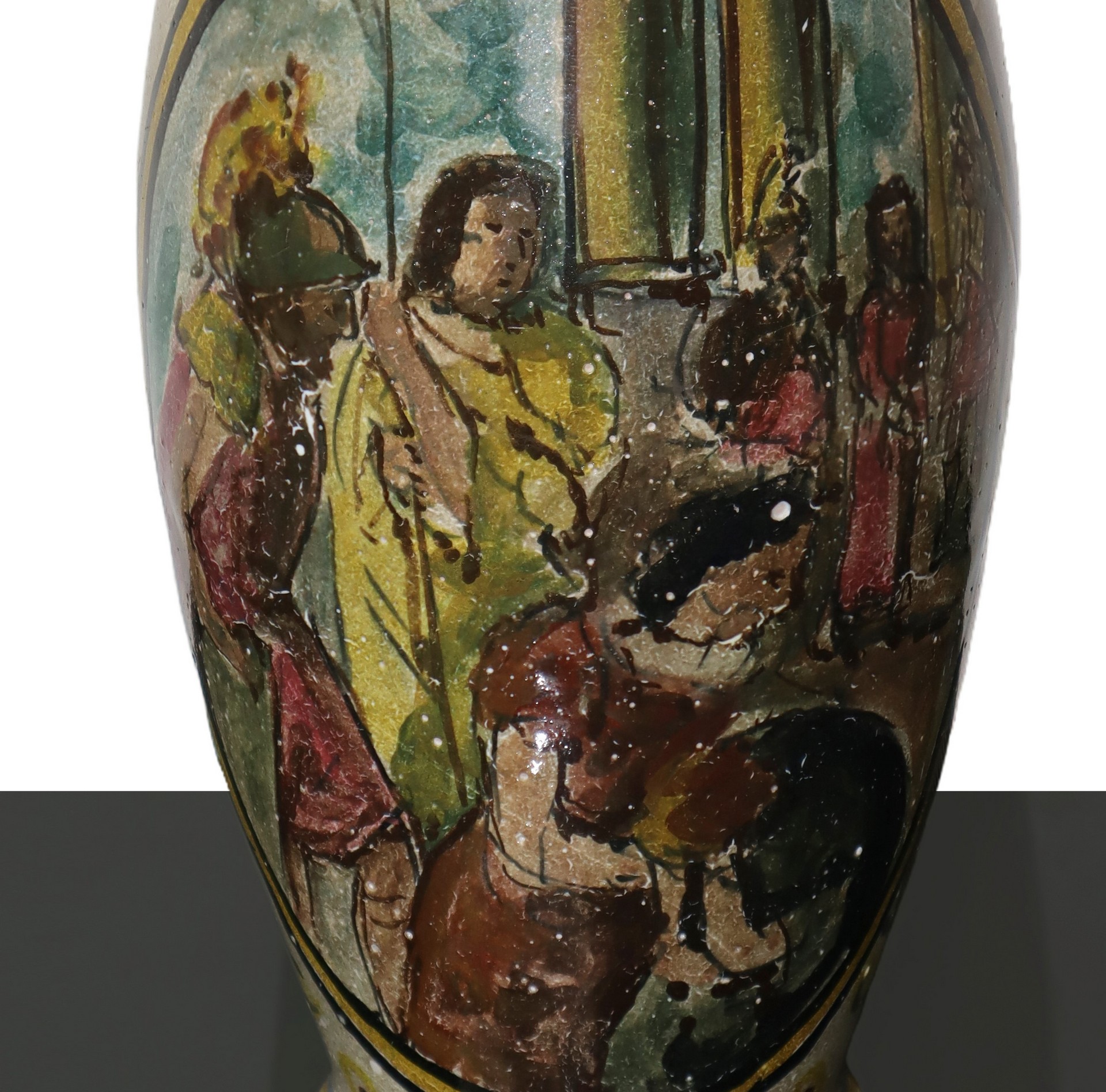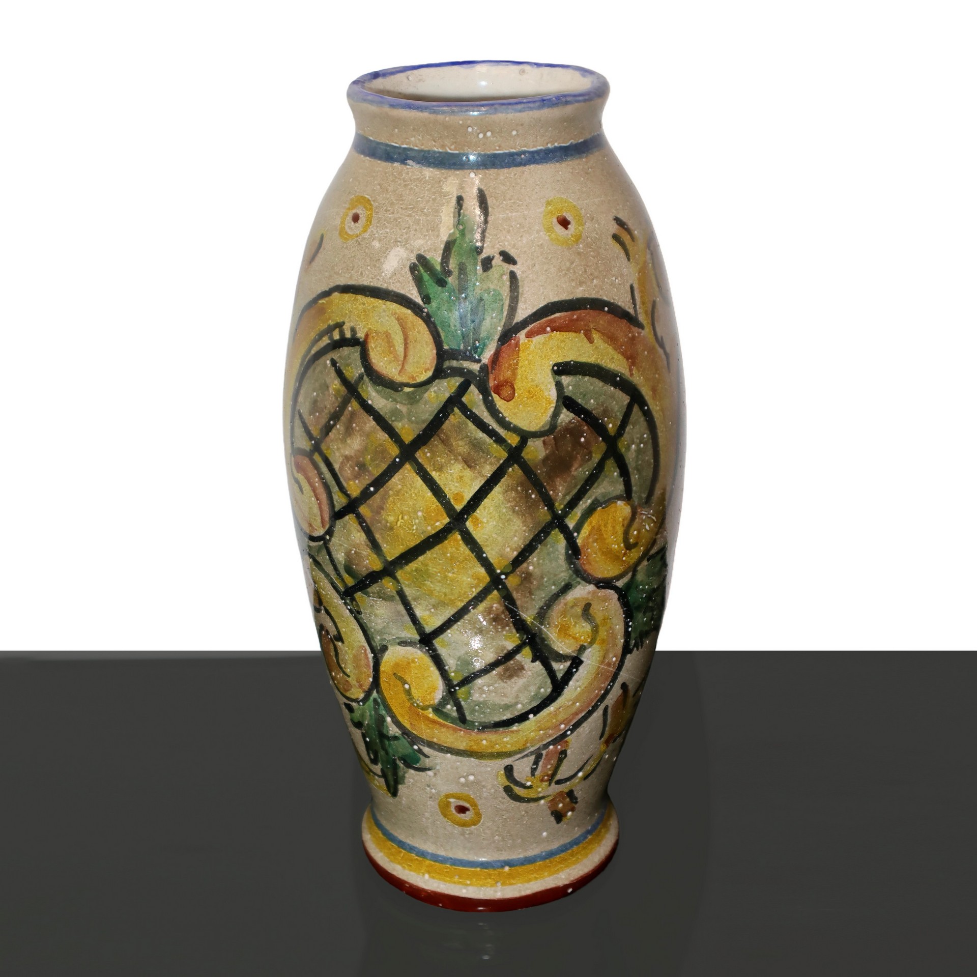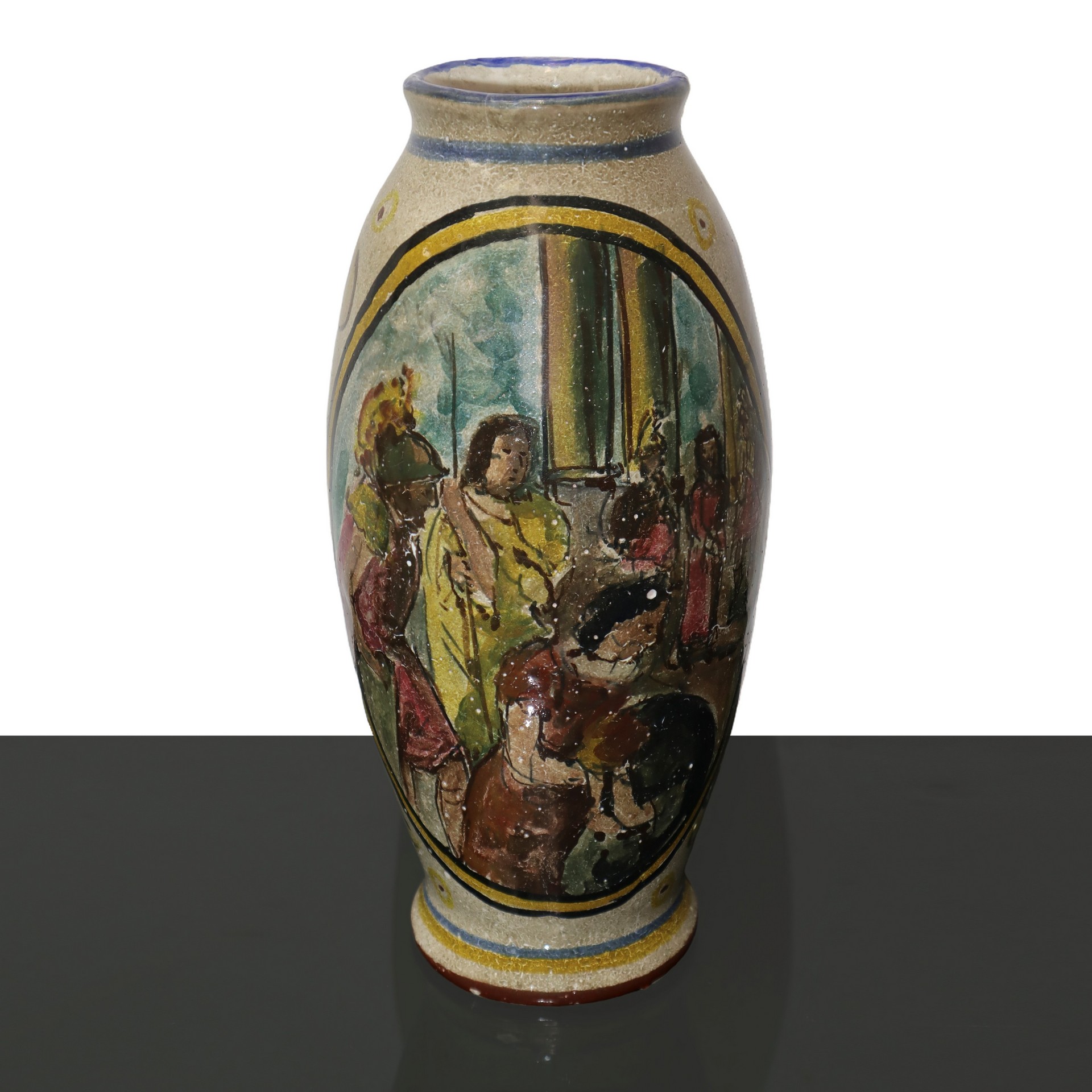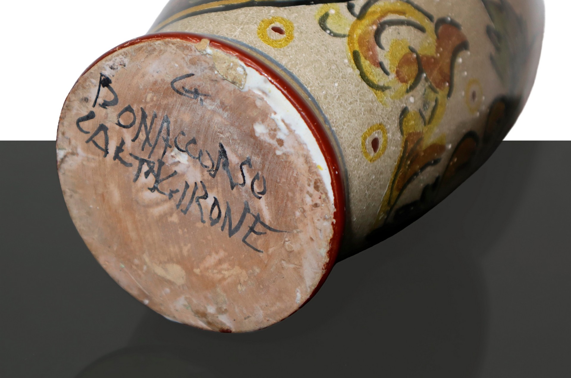 Vaso in ceramica di Caltagirone invetriata con raffigurazione di personaggi H cm 26Sul fondo firmato BonaccorsoSul fondo firmato Bonaccorso