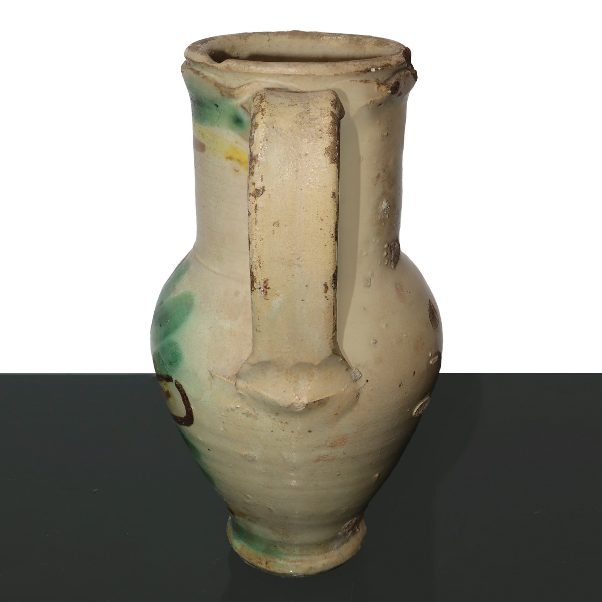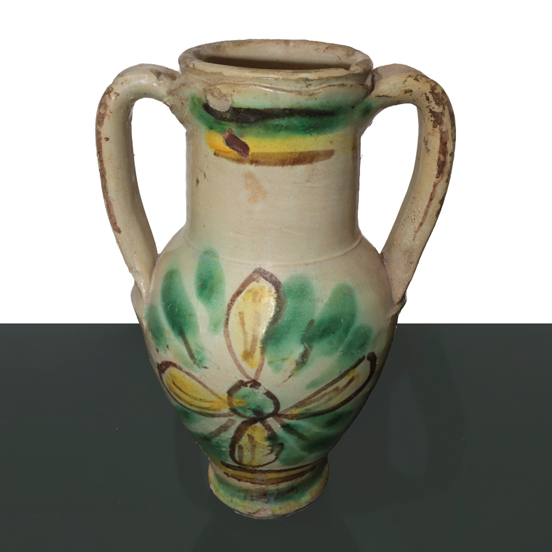 Piccola quartara in maiolica policroma di Caltagirone con manici e decorazioni di foglieH cm 24