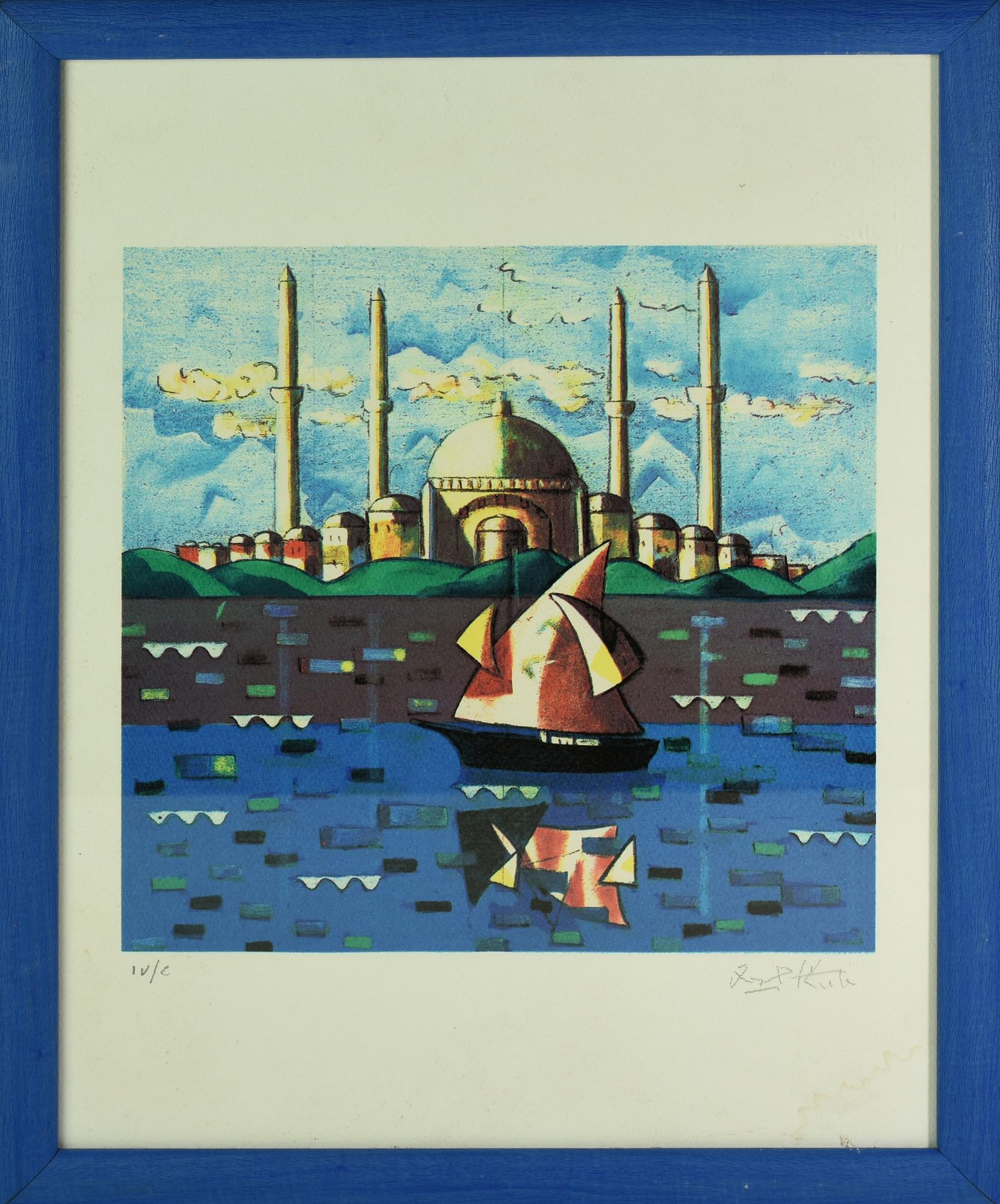 Ibrahim Kodra BARCHE CON CHIESA litografia su carta, cm 44x33; es. IV/L firma...