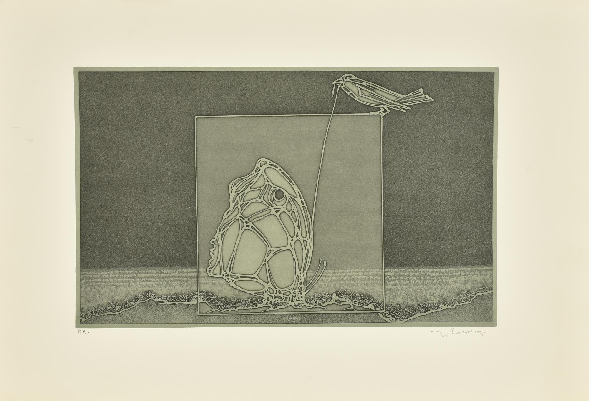 Francesco Casorati FARFALLA E UCCELLO incisione su carta, cm 31x49, su foglio...