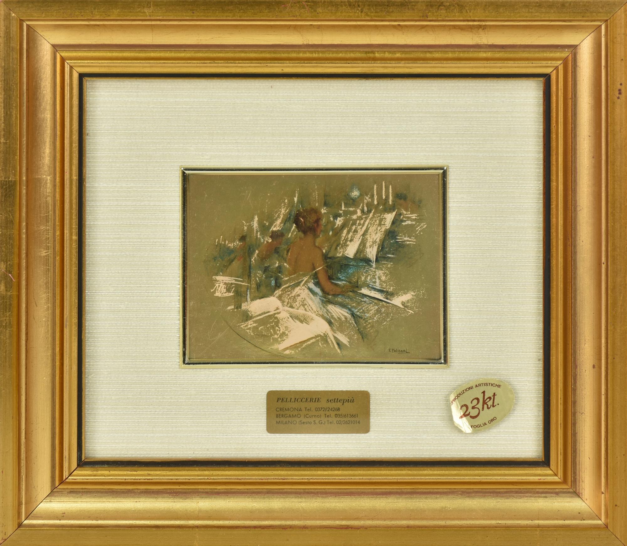 Enrico Felisari AL PIANO serigrafia su lamina metallica, cm 9x12 firma in lastra