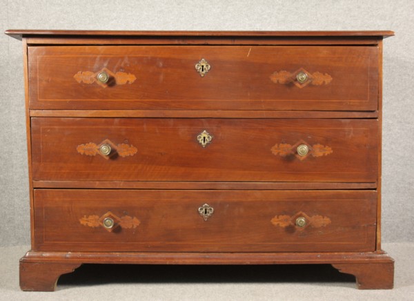 Firmato, datato. Canterano tre cassetti in legno di noce. XVII secolo. Restauri. Mis. Lung. cm. 139 Alt. cm. 94 Prof. cm. 58 ca.