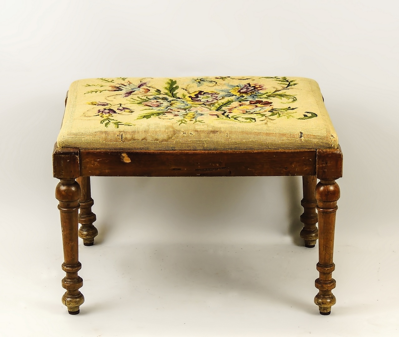 PANCHETTO IN NOCE - WALNUT STOOL rivestito a piccolo punto con motivi floreali, gambe tornite, piedini a trottola h cm 38x55x42