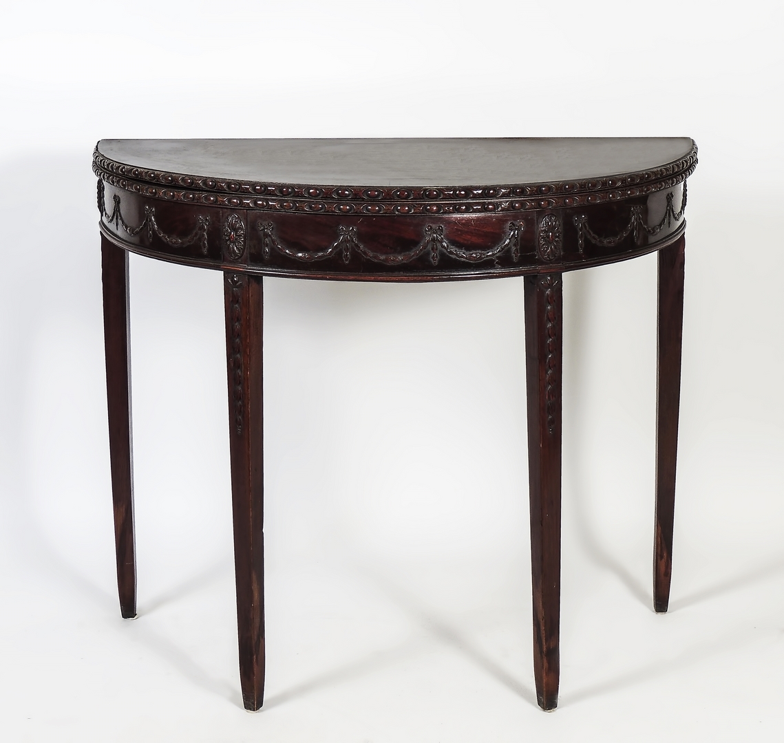 TAVOLINO DA GIOCO A MEZZALUNA IN MOGANO - MAHOGANY CARD TABLE fine del XIX/inizio del XX secolo - late 19th/early 20th Century ripiano a libro, fascia intagliata con festoni, gambe a faretra h cm 77x91x45