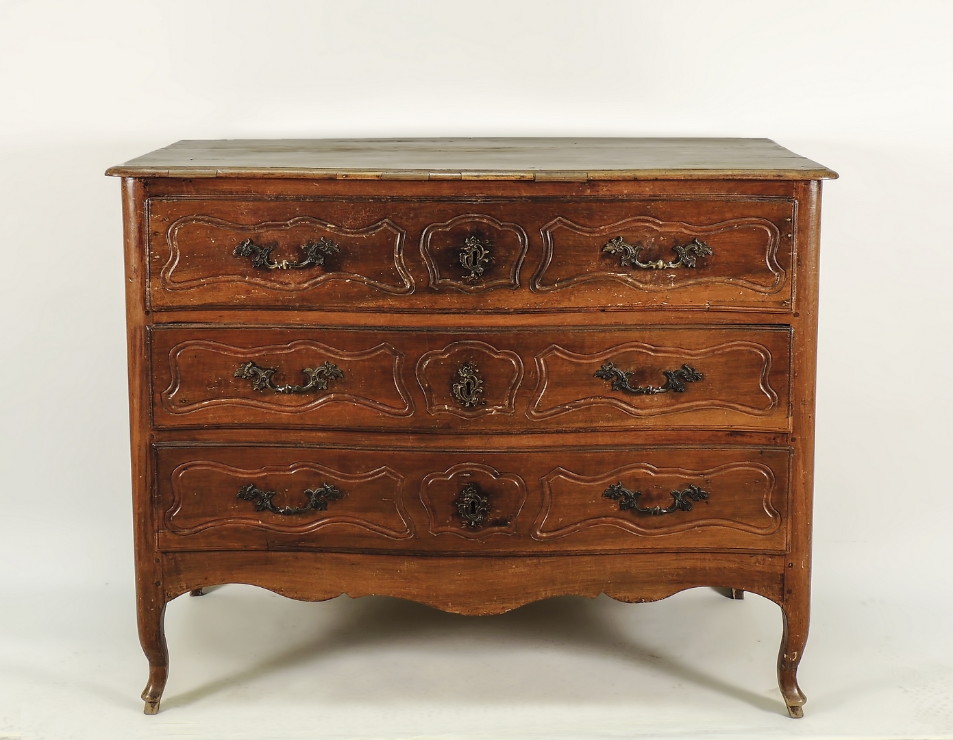 CASSETTONE IN NOCE - WALNUT COMMODE XIX secolo - 19th Century tre cassetti con formelle sagomate sul fronte leggermente mosso, pendaglina mossa piedi a ricciolo h cm 98x120,5x61