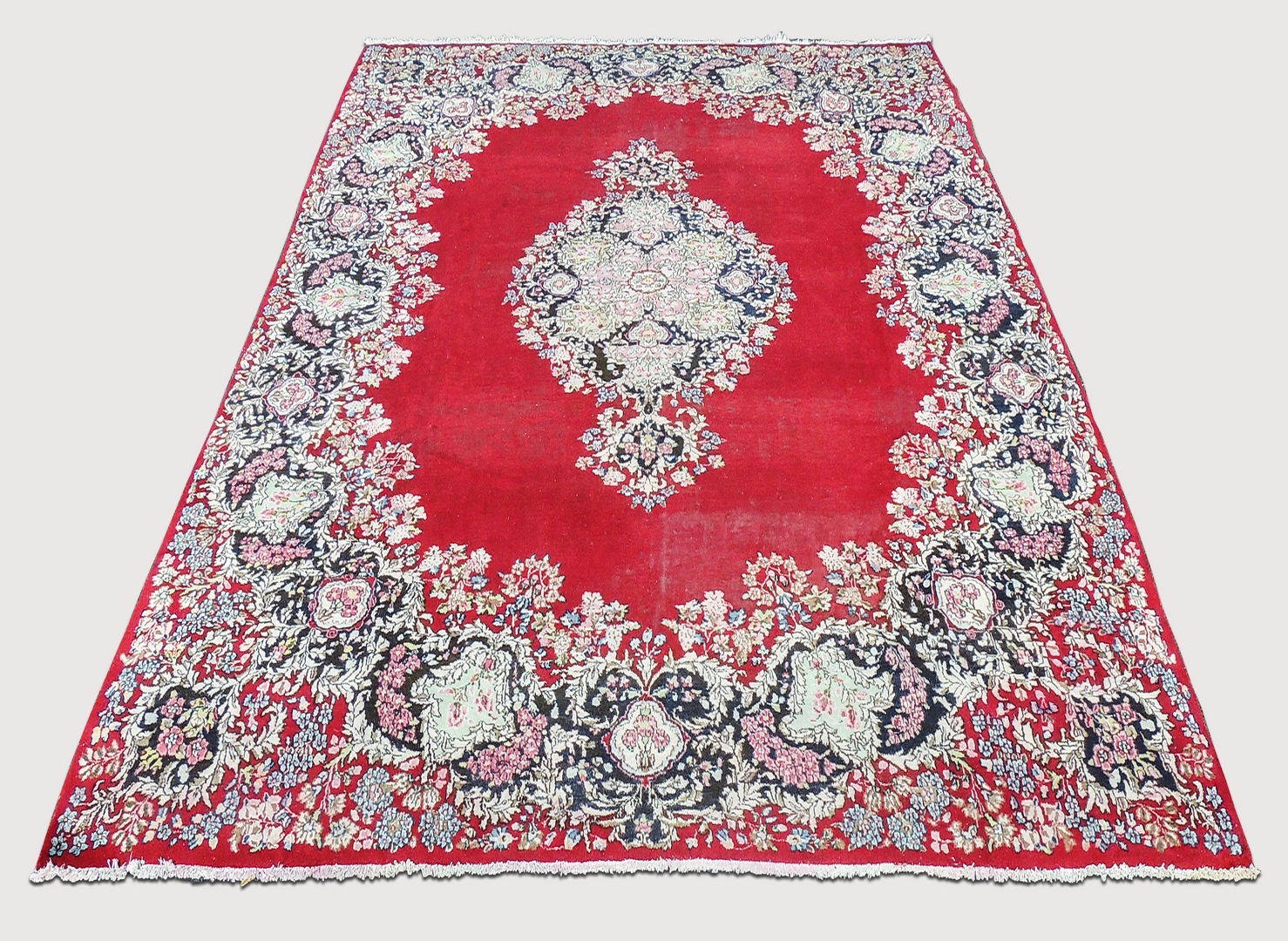 TAPPETO PERSIANO KIRMAN IMPERIALE - IMPERIAL PERSIAN KIRMAN CARPET vecchia manifattura, fondo rosso, campo a motivo floreale, medaglione centrale blu, bordura nei toni del blu e del rosso, difetti cm 395x300