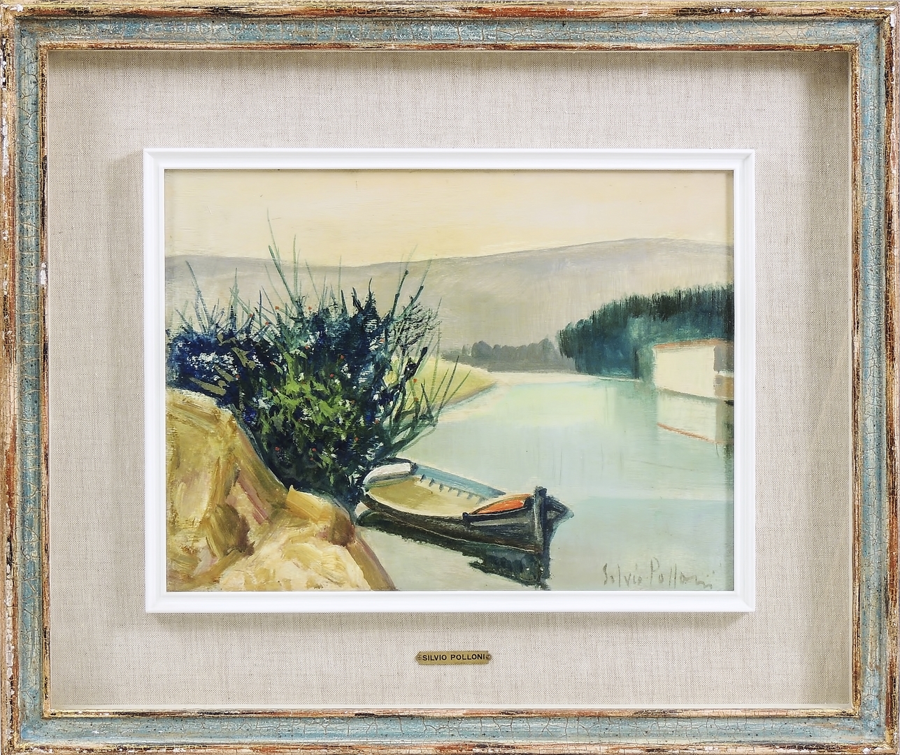 SILVIO POLLONI (1888-1972) Paesaggio fluviale con barca - River Landscape with Boat olio su tavoletta - oil on panel, firmato, al verso firmato e datato 70, in cornice cm 30x40
