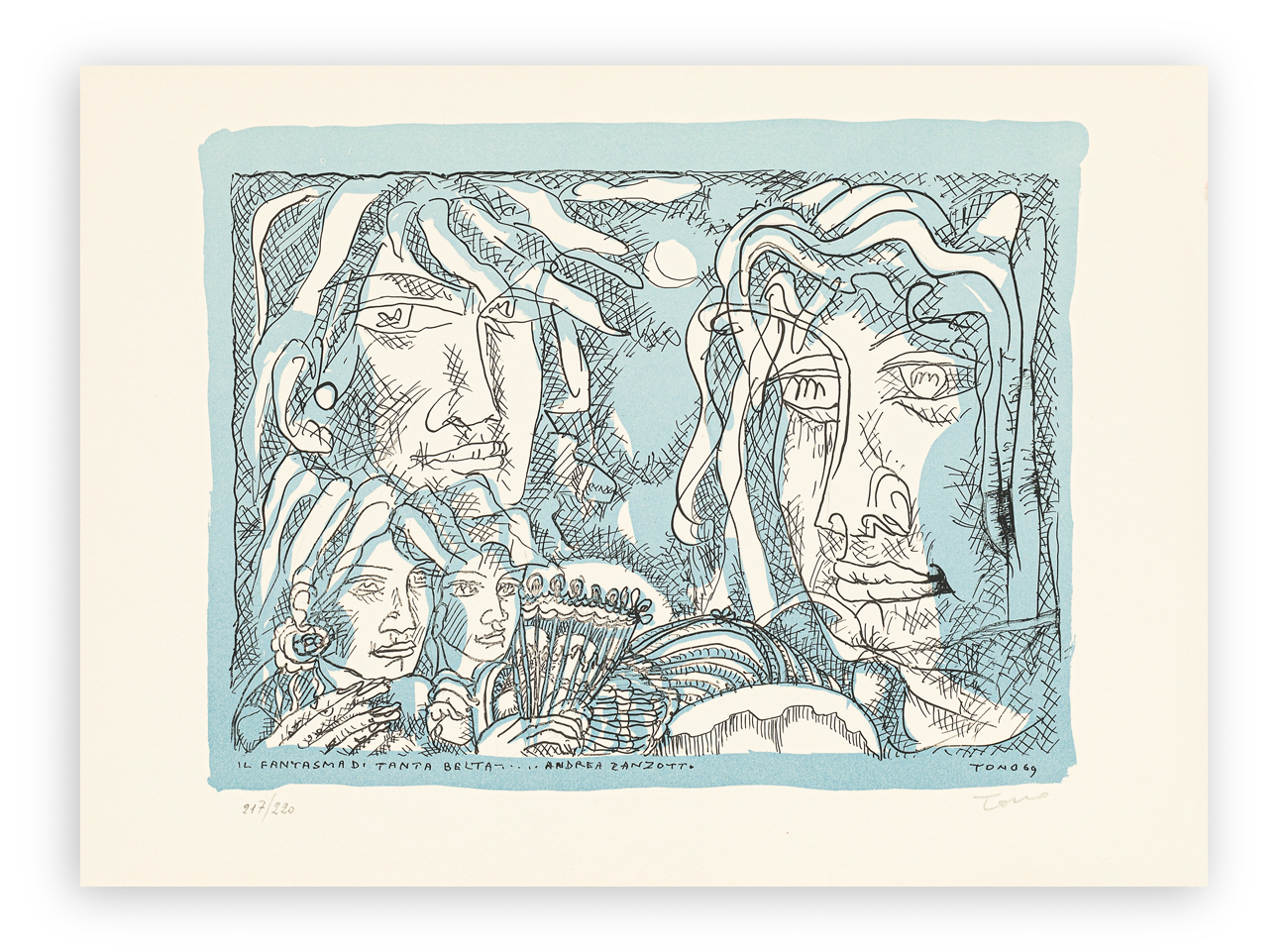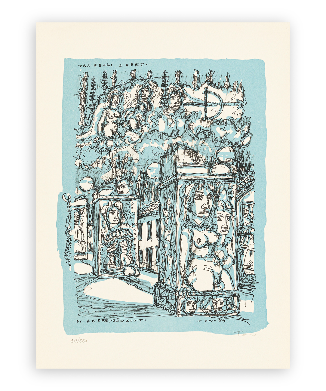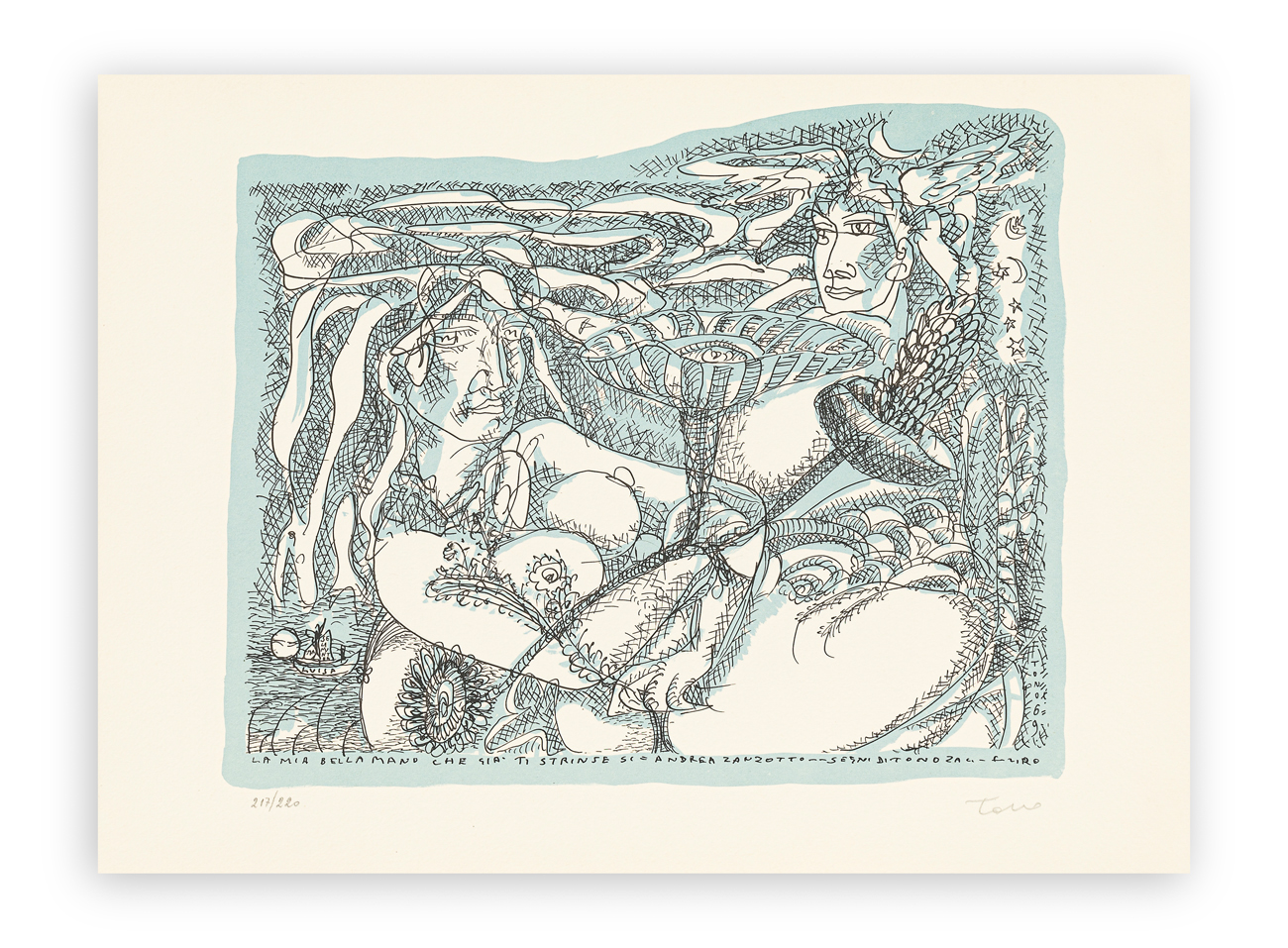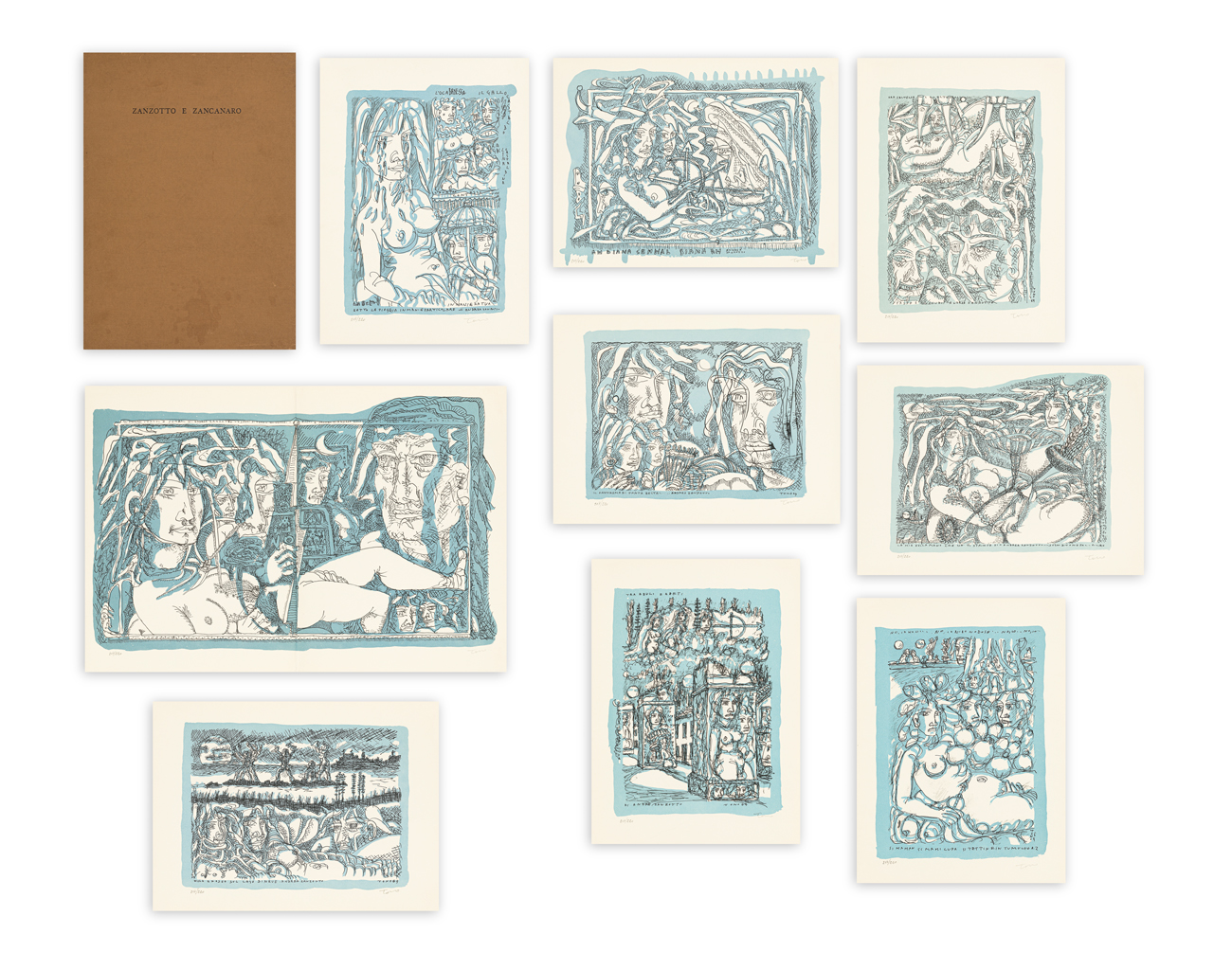 Cartella contenente un componimento di Andrea Zanzotto e 9 litografie sciolte di Tono Zancanaro, ciascuna recante firma e numerazione (Esemplari 217/220) a matita al fronte