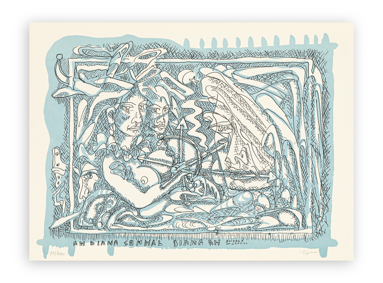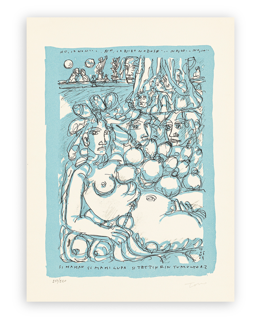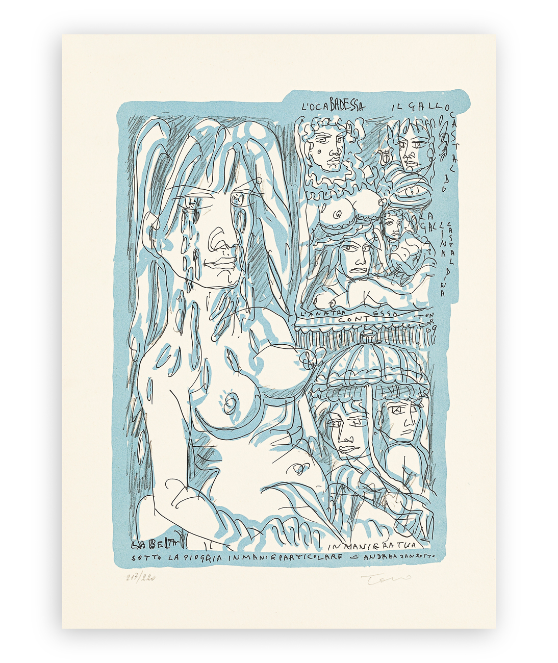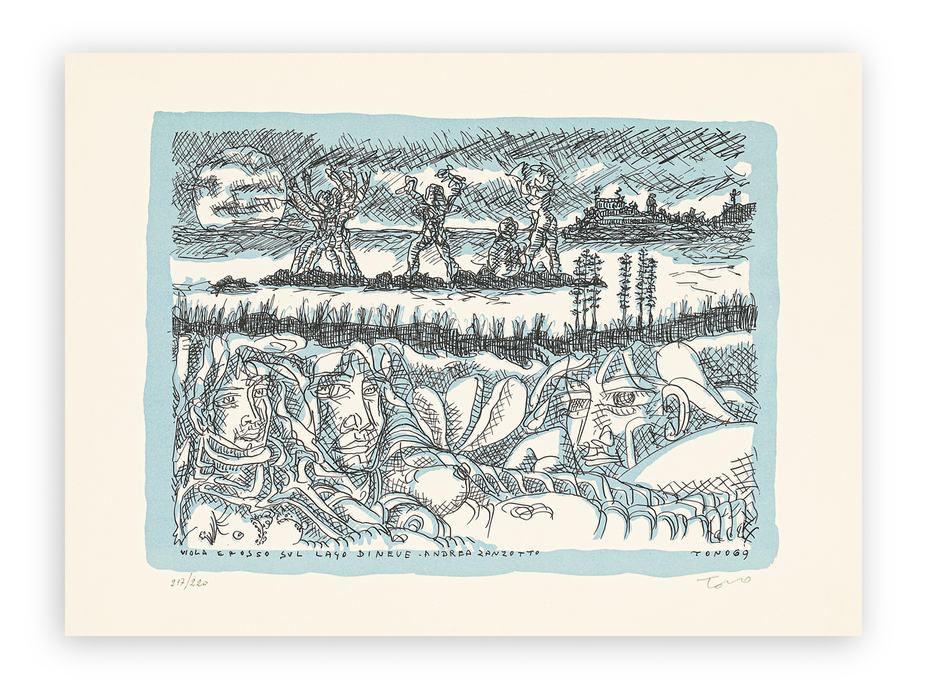 Cartella contenente un componimento di Andrea Zanzotto e 9 litografie sciolte di Tono Zancanaro, ciascuna recante firma e numerazione (Esemplari 217/220) a matita al fronte