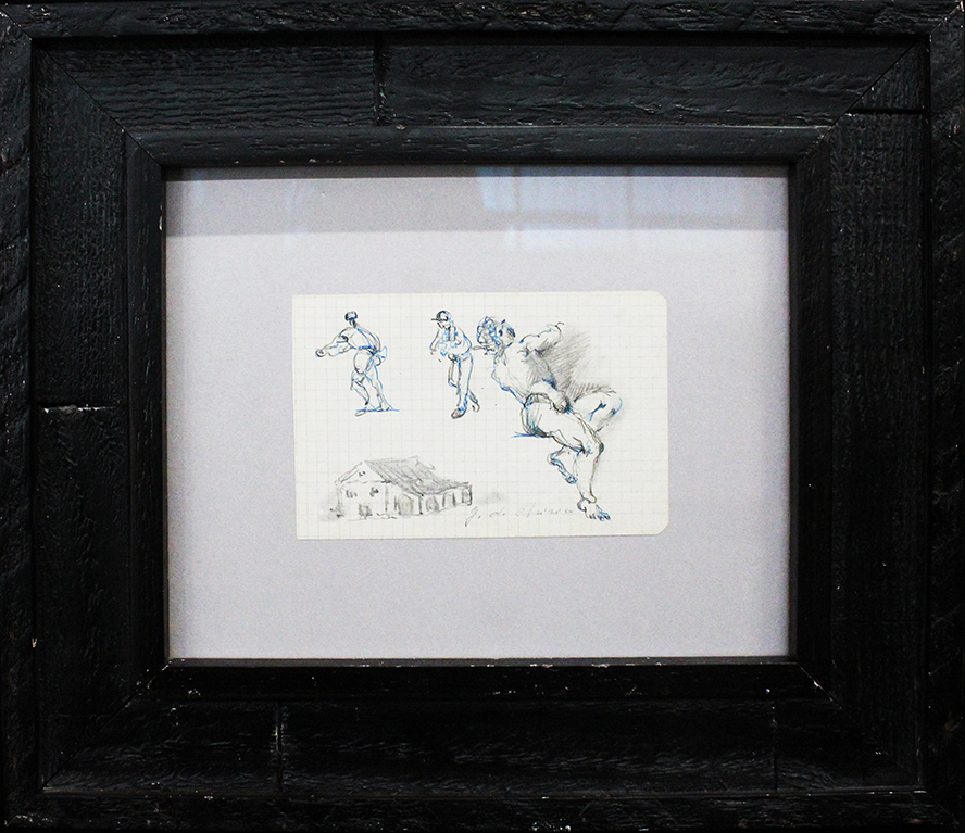 GIORGIO DE CHIRICO, "Studio di figure e paesaggio", fine anni '50, matita e inchiostro su carta, dim 9,5x14,3. Opera archiviata presso l'archivio Giorgio e Isa De Chirico, al fronte: firma in basso a destra. Opera con cornice.