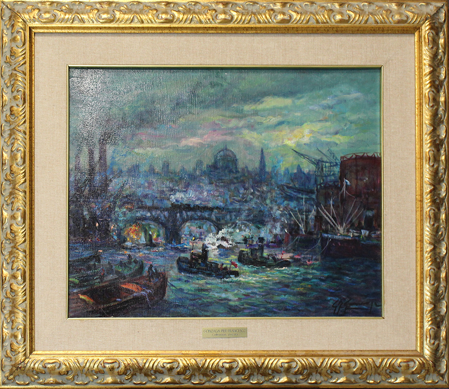 GIAN FRANCESCO GONZAGA, "Il porto di Brema", 1979, olio su tela, dim. 40x50. Al fronte: firma in basso a destra, al verso: anno, firma, titolo, dimensione, dichiarazione di autenticità. Opera archiviata dall'archivio Gian Francesco Gonzaga. Opera con cornice.