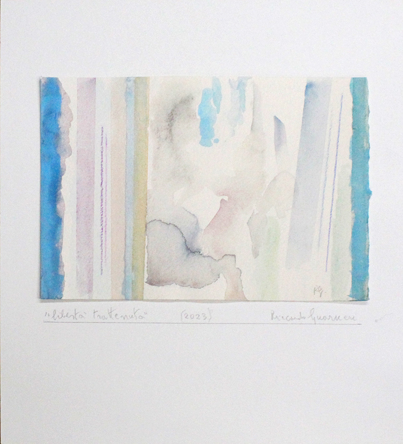 RICCARDO GUARNERI, "Libertà trattenuta", 2023, tecnica mista (acquarello e grafite) su cartoncino, dim 30x25, autentica su foto dell'artista. Al fronte: in basso a sinistra titolo, in basso al centro data, in basso a destra firma; in basso a destra nell'acquarello sigla d'artista "RG". Opera con cornice e vetro protettivo.