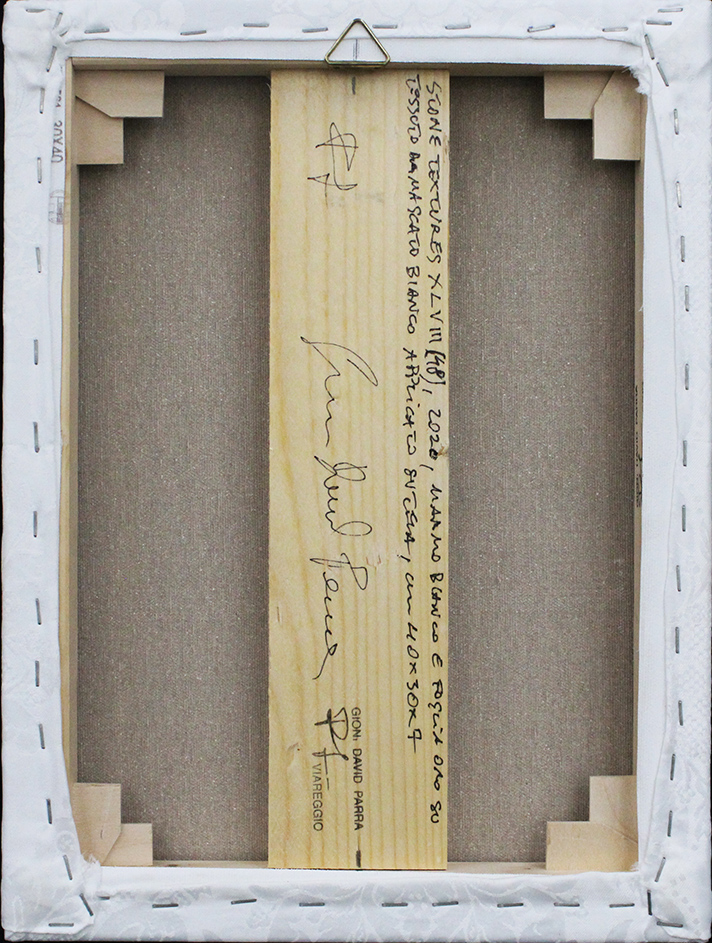 GIONI DAVID PARRA, "Stone Textures XLVIII" (N°48), 2020, marmo bianco e foglia oro su tessuto damascato bianco applicato su tela, cm 40x30x7, autentica su foto dell'artista. Al verso: firma, timbro dell'artista, tecnica, anno, dimensione.