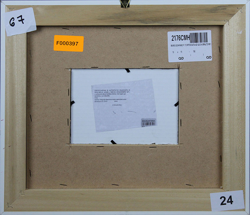 MARIO SCHIFANO, Il grande sole giallo, 1990 - 97, Foto ritoccata a smalto, Esemplare unico, Dim. 10x15, Opera archiviata presso la Fondazione Mario Schifano " Archivio Generale dell' Opera di Mario Schifano " con n° archivio: F90-97/6377, il 13 settembre 2007. Opera pubblicata sul catalogo " Mario Schifano fotografie ritoccate " a pag. 502 Volume II. Al verso: firma "Schifano", Opera con cornice.