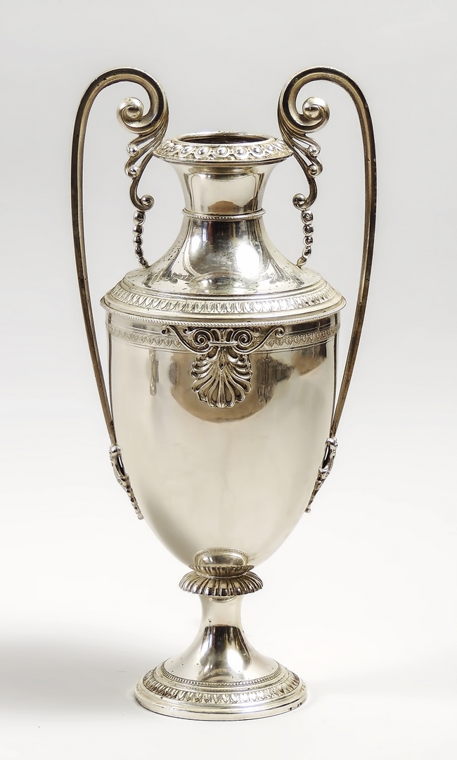 VASO AD ANFORA IN ARGENTO - SILVER AMPHORA corpo ad ogiva centrato da palmetta, anse a voluta, base sbalzata a palmette h cm 40, gr 1280