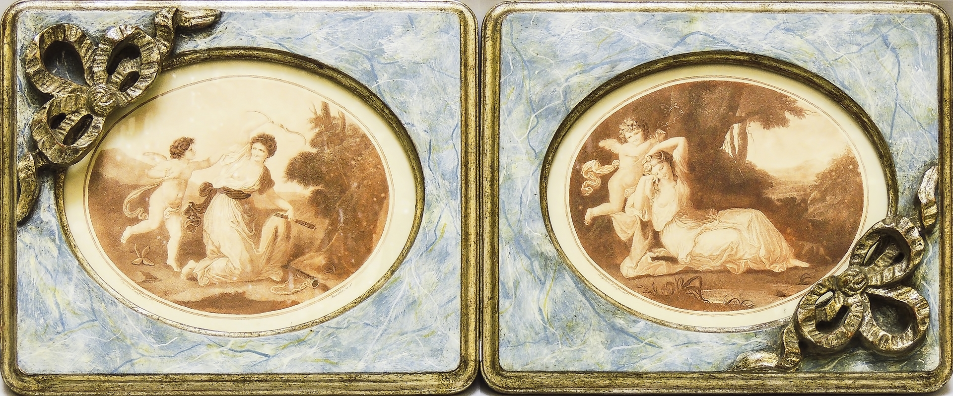DA FRANCESCO BARTOLOZZI - FROM FRANCESCO BARTOLOZZI Scene mitologiche - Mythological Scenes coppia di litografie ovali - a pair of oval lithographs, in cornice in legno dipinto a finto marmo decorata con fiocco cm 20,5x25