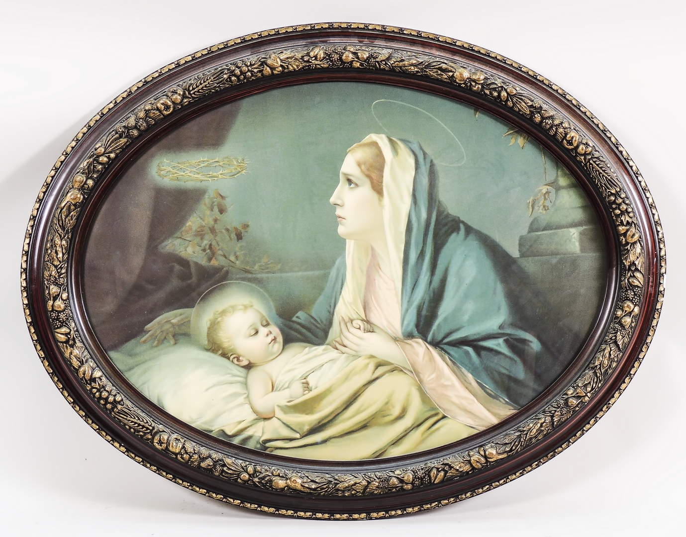 CORNICE OVALE IN LEGNO E PASTIGLIA - WOODEN AND PASTIGLIA OVAL FRAME decorata con moivi di frutta, contenente oleografia la luce cm 52x72 circa