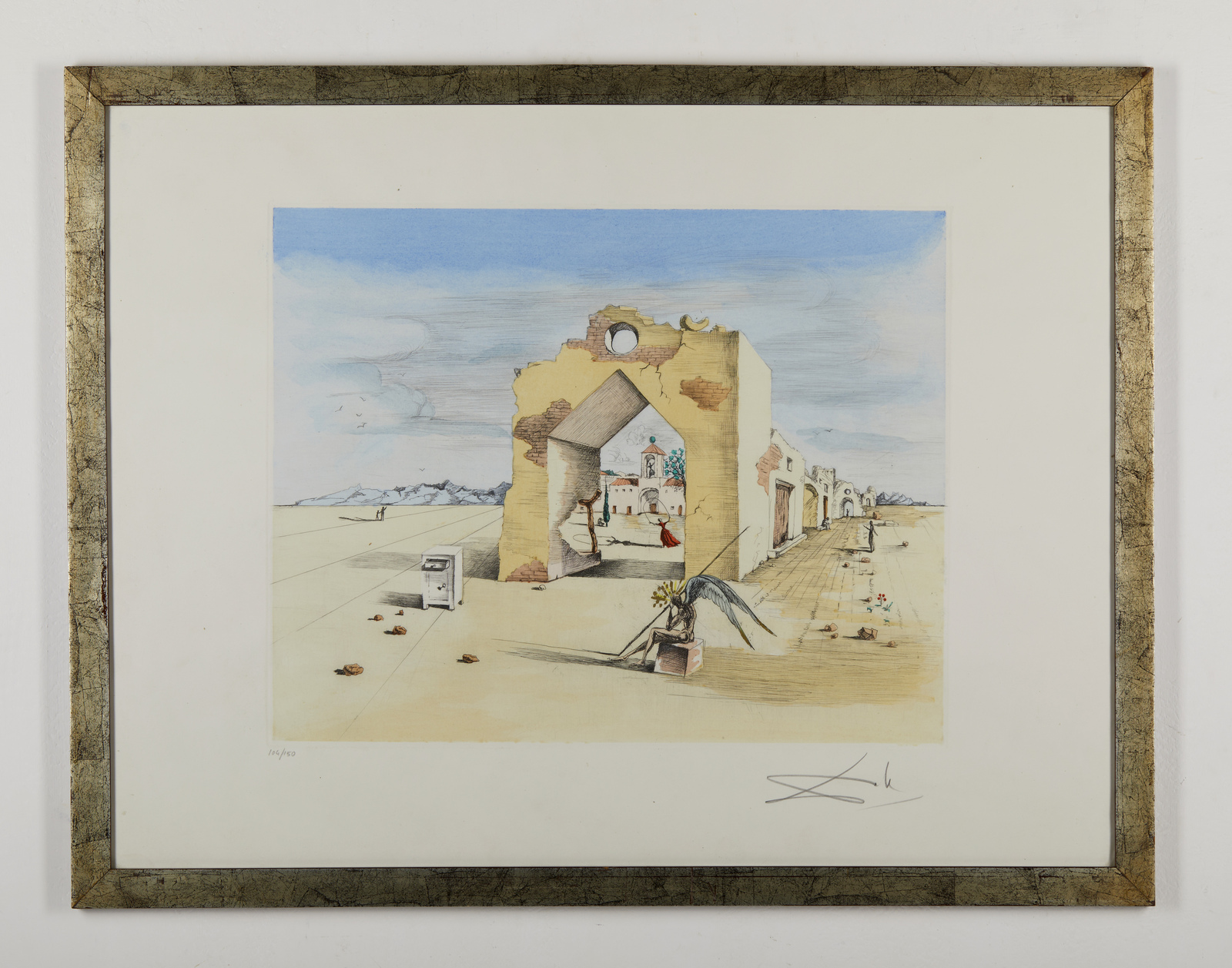 DALI' SALVADOR (1904 - 1989) D'apres. Il villaggio paranoico. Acquatinta. Cm 74,00 x 56,00. 104/150. Tiratura e firma in basso a matita. Filigrana Lana 1590. Dimensione lastra: 39.5x49.5 cm. Cornice presente