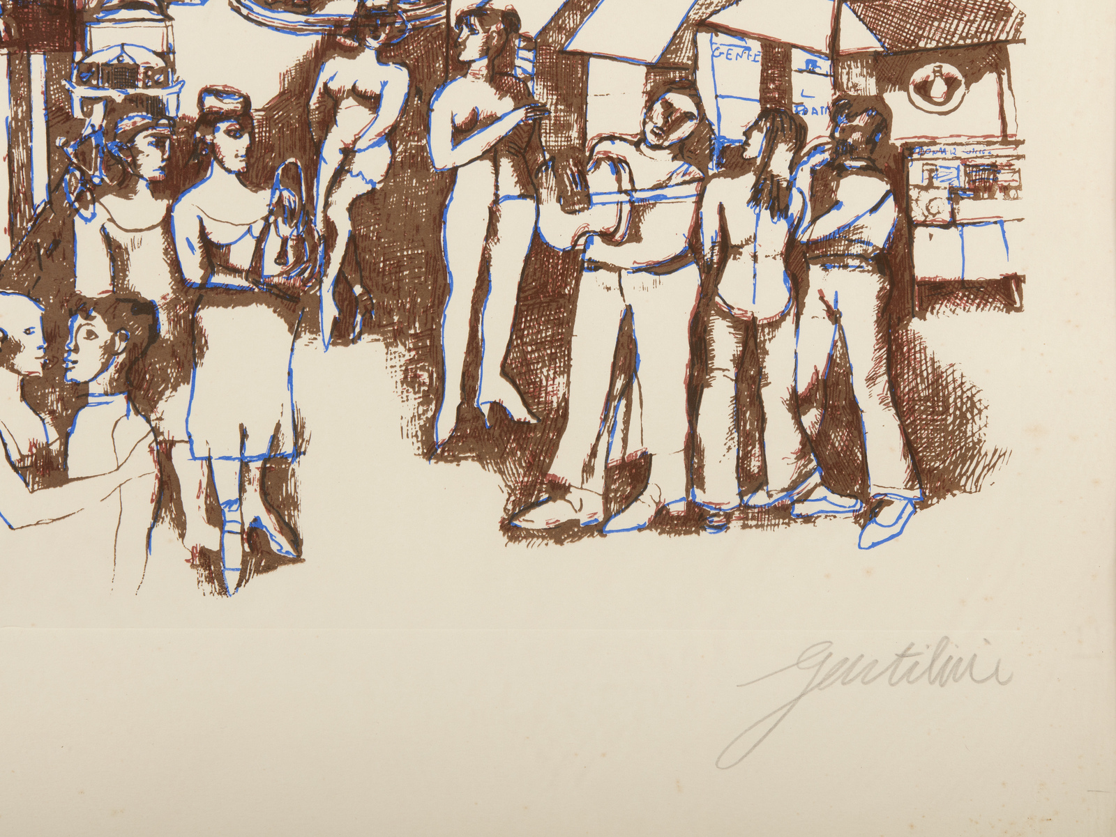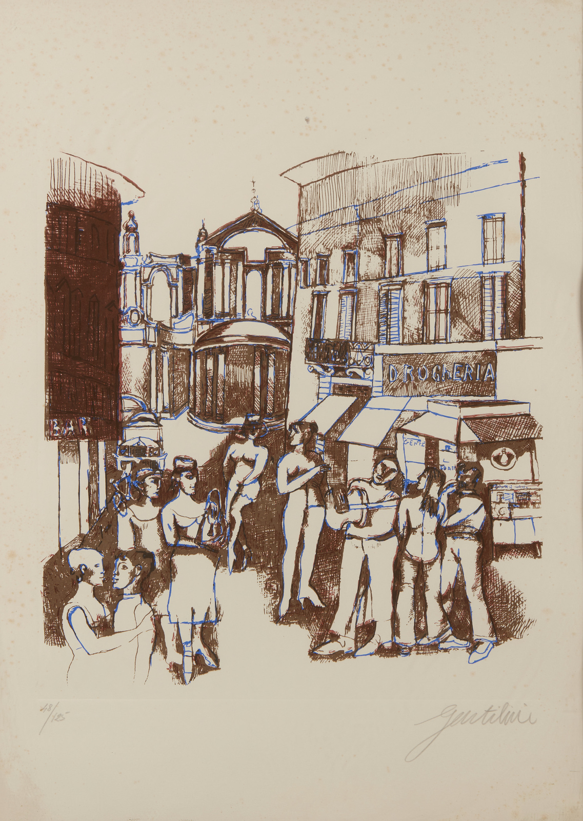 GENTILINI FRANCO (1909 - 1981) Drogheria. Acquaforte a colori. Cm 50,00 x 70,00. 48/125. Tiratura e firma in basso a matita. Dimensione lastra: 47x41 cm. Difetti. . Cornice presente