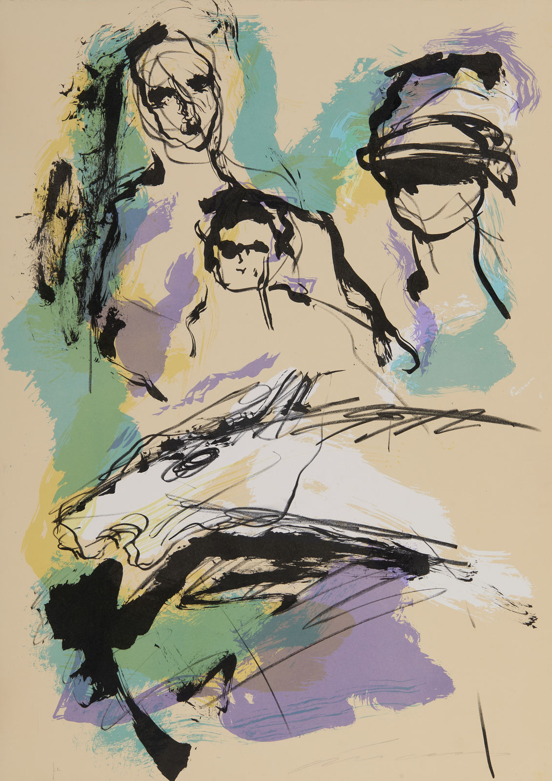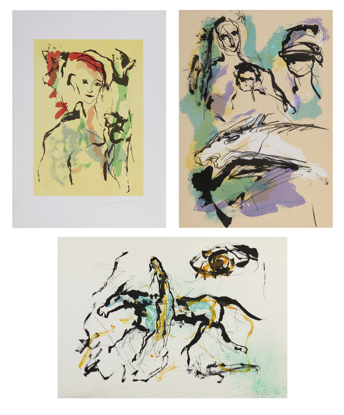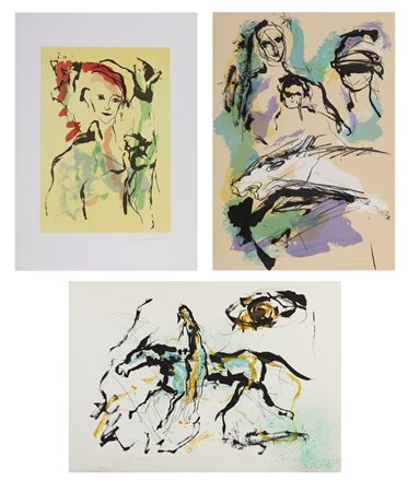 TRECCANI ERNESTO (1920 - 2009) Lotto composto da n. 3 fogli. Senza titolo. Litografia. Cm 50,00 x 70,00. P.a. Tiratura e firma in basso a matita. Dimensioni: 53x75 cm; 70x50 cm (x2). Lievi difetti.