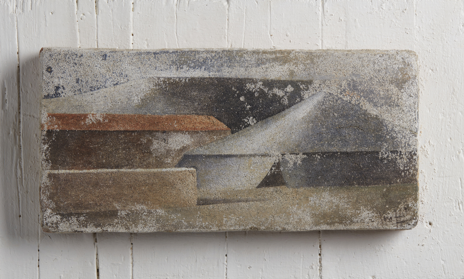 SCUFFI MARCELLO (n. 1948) Senza titolo. Affresco su tavola. Cm 34,00 x 17,00 x 4,00. Firma in basso a destra. Affresco su mattone su tavola. Dimensione con tavola: 26.5x44x8 cm. Autentica dell'artista su fotografia.