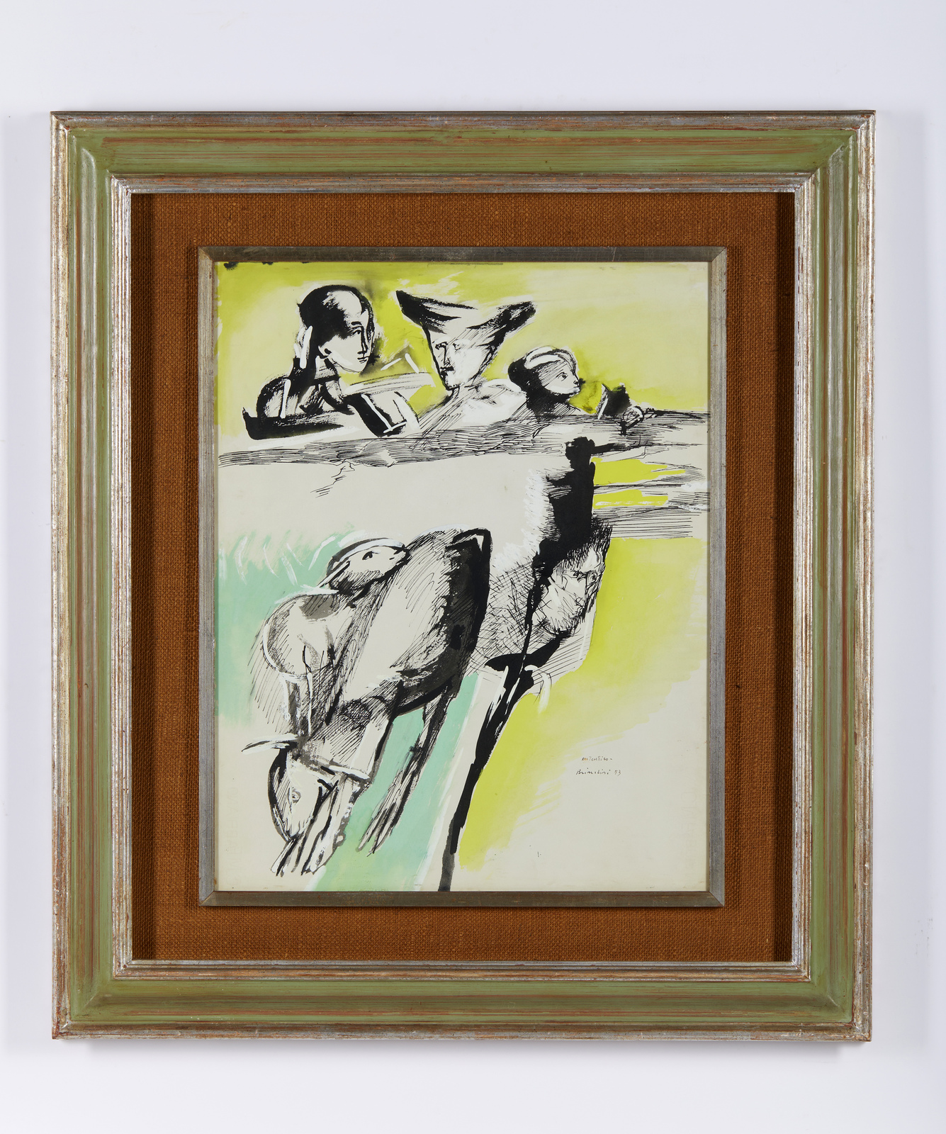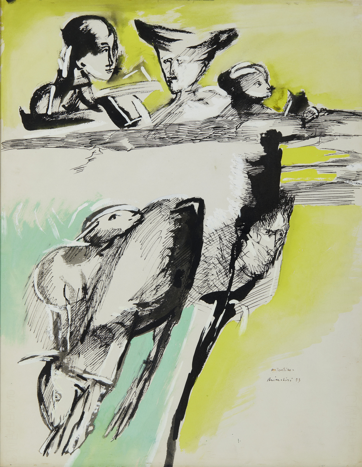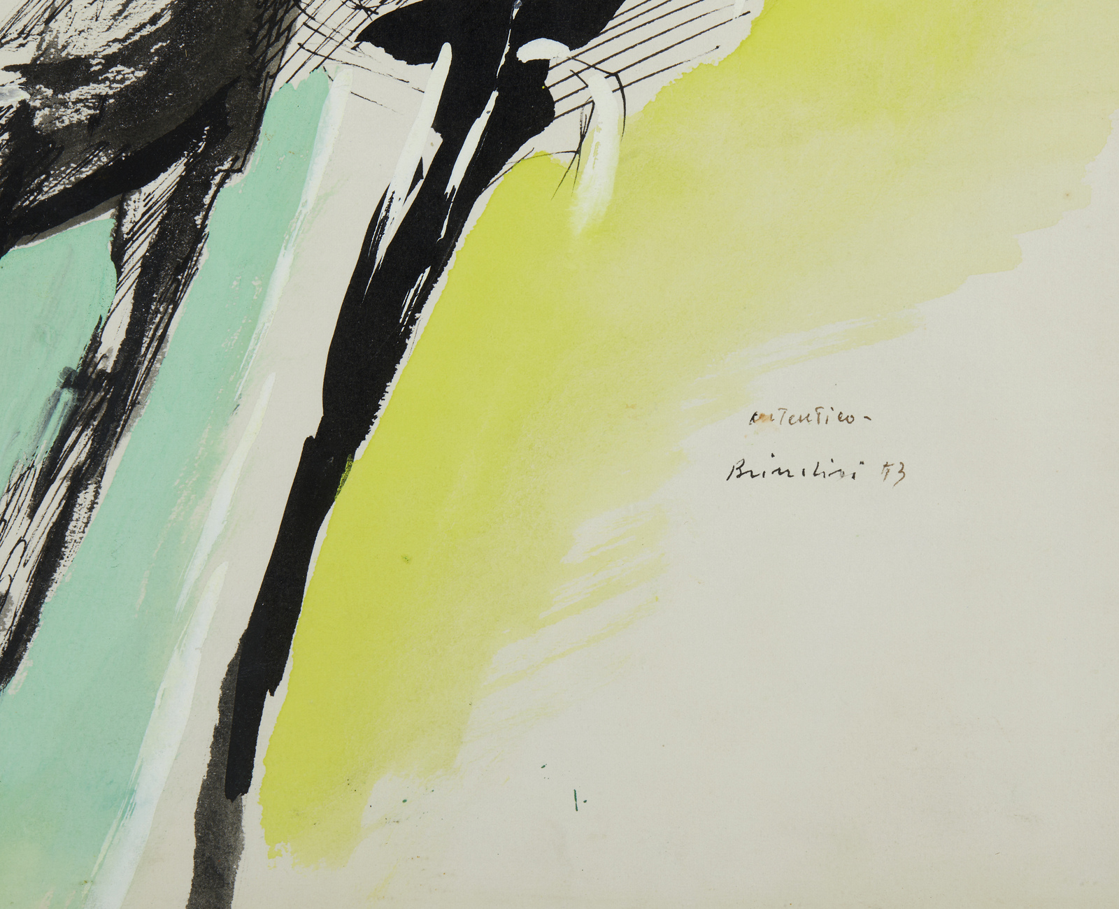 BRINDISI REMO (1918 - 1996) Senza titolo. 1953. Tecnica mista su carta. Cm 50,00 x 62,50. Firma e anno in basso a destra. Carta CM Fabriano. Certificato di provenienza Galleria d'Arte Perli, Reggio Emilia. Esposizioni: Personale dell'artista, Galleria d'Arte Perli, Reggio Emilia, 20 febbraio-7 marzo 1971. Cornice presente