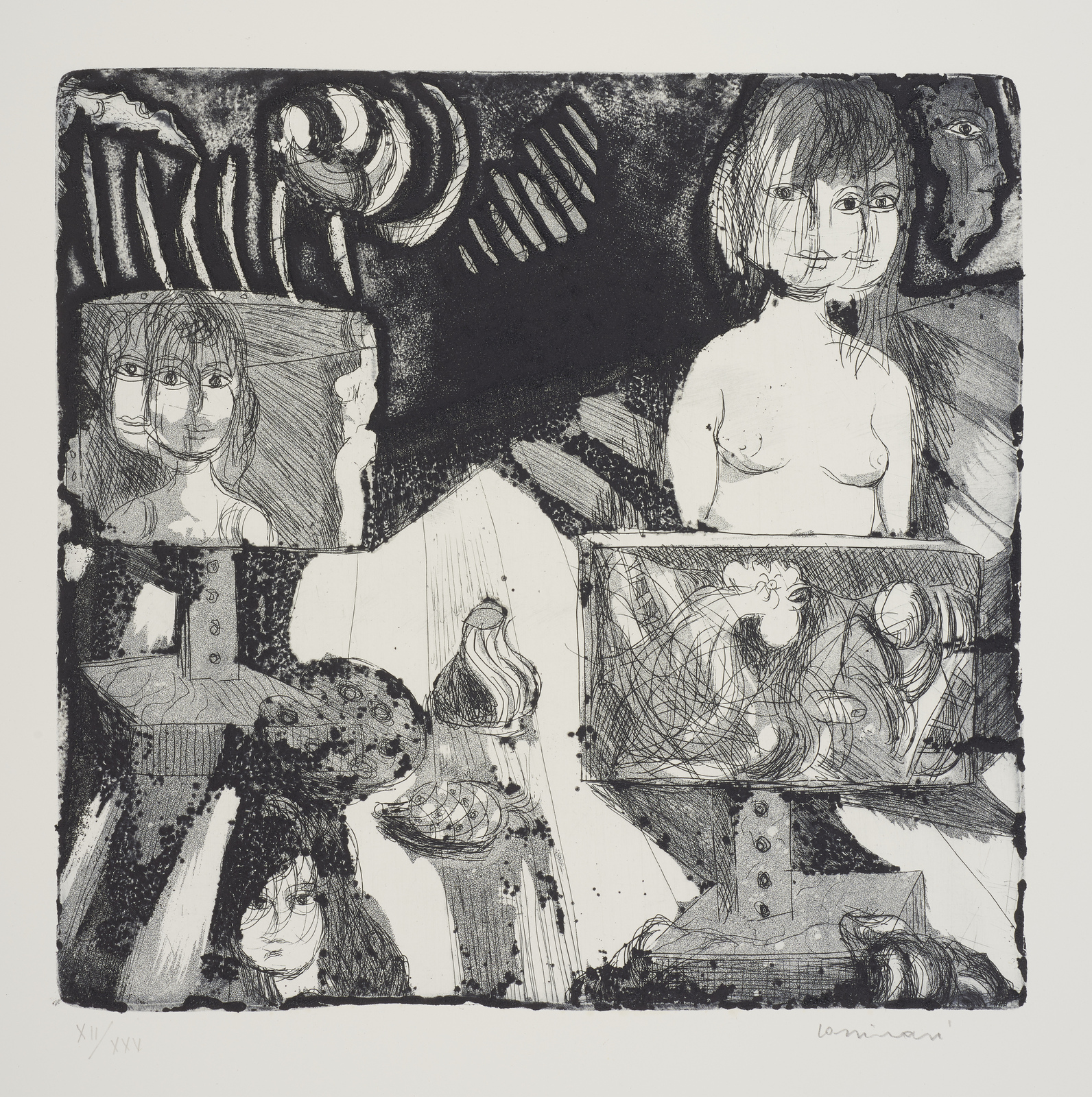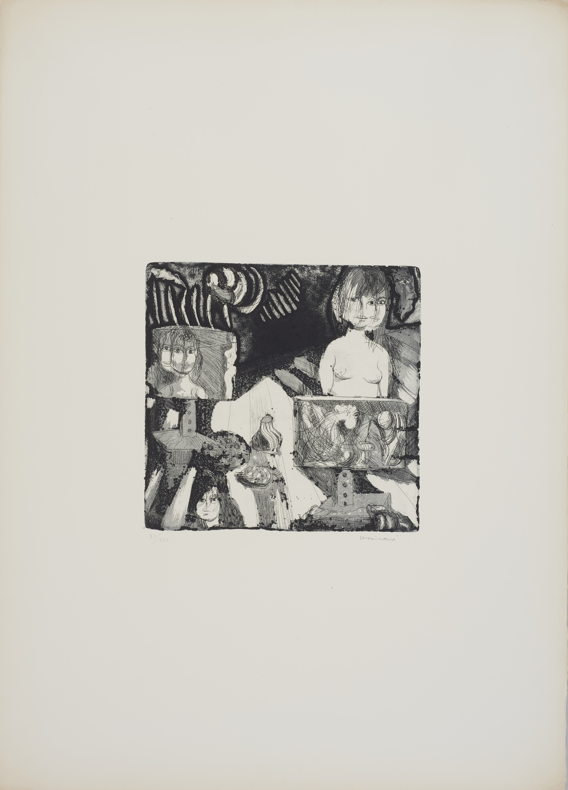 CASSINARI BRUNO (1912 - 1992) Atelier. Acquaforte e acquatinta. Cm 51,00 x 70,50. XII/XXV. Tiratura e firma in basso a matita. Dimensione lastra: 23.8x24.3 cm.