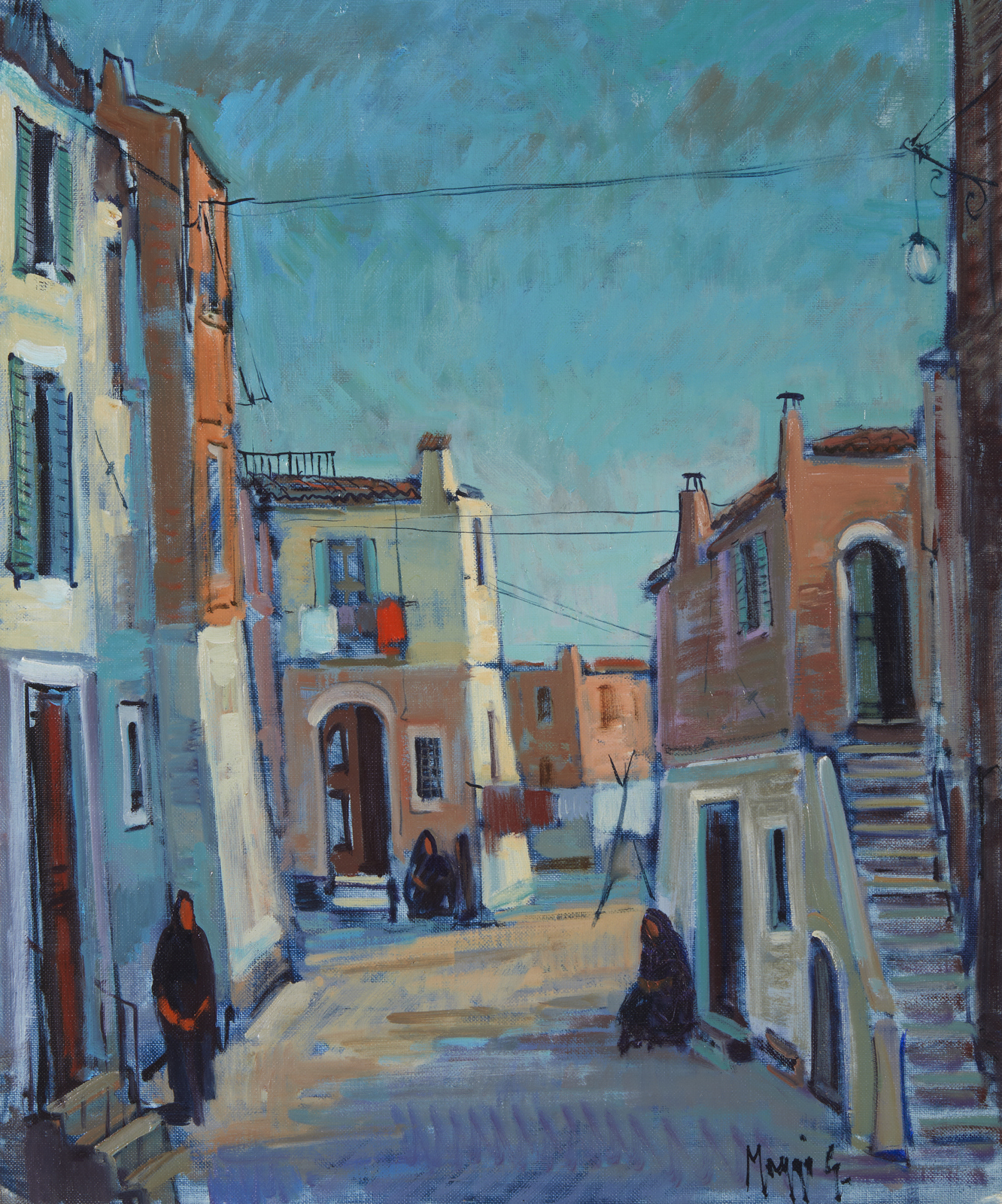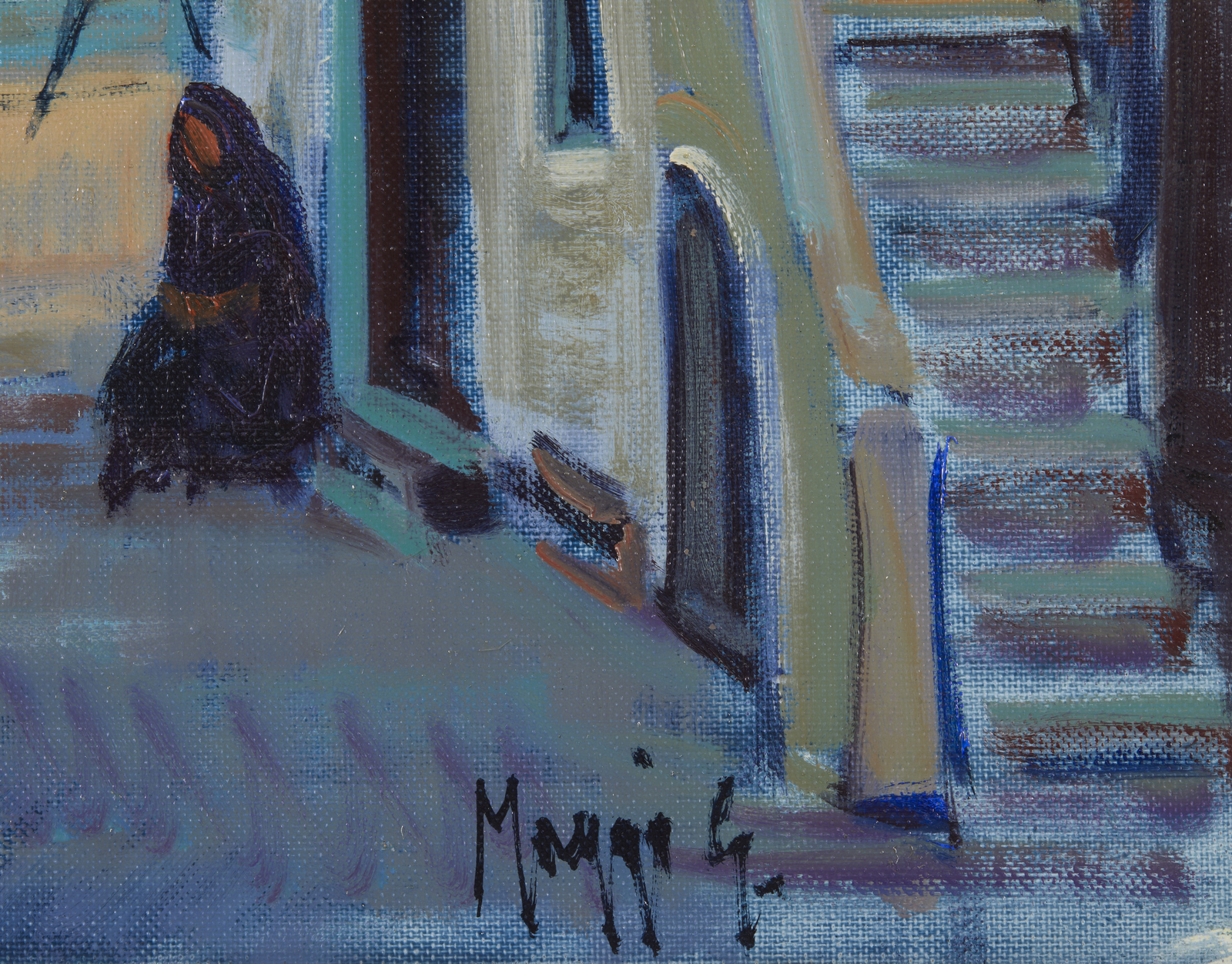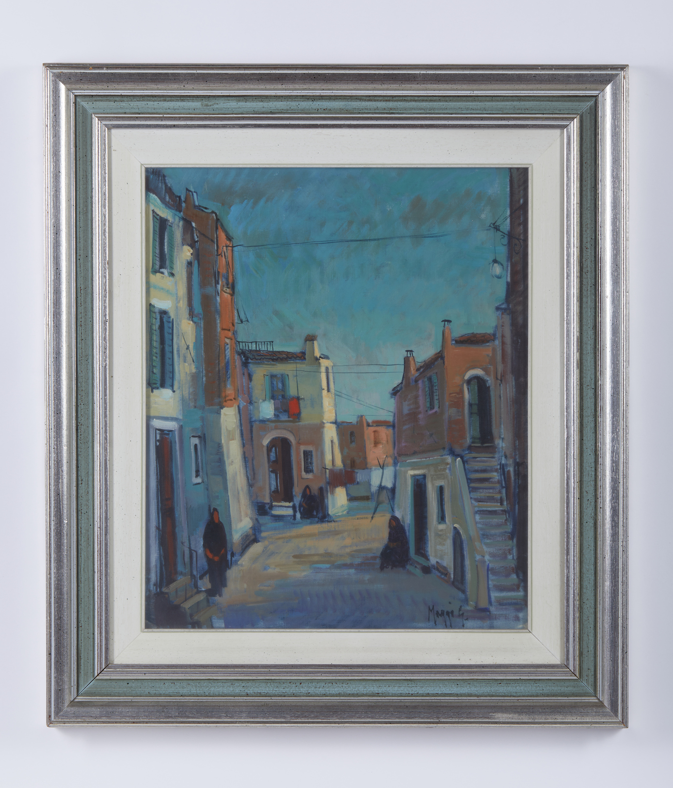 MAGGI GIAMPIETRO (n. 1934) Meriggio. Olio su tela . Cm 50,00 x 60,00. Firma in basso a destra. Al retro titolo e firma. Cornice presente