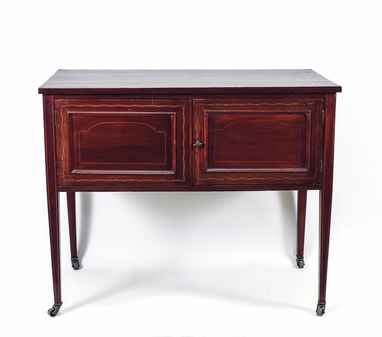 PICCOLO STIPO IMPIALLACCIATO IN MOGANO - SMALL MAHOGANY VENEERED CABINET intarsiato con filettature, due sportelli sul fronte dritto, gambe a faretra su rotelle h cm 76,5x93x47