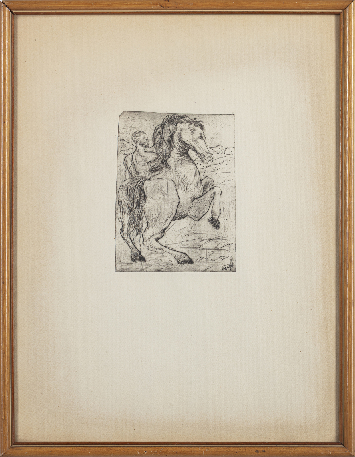 SASSU ALIGI (1912 - 2000) Senza titolo. Acquaforte. Cm 34,00 x 44,50. Non numerata. Firma in lastra in basso a destra. Dimensioni lastra: 16x11 cm. . Cornice presente