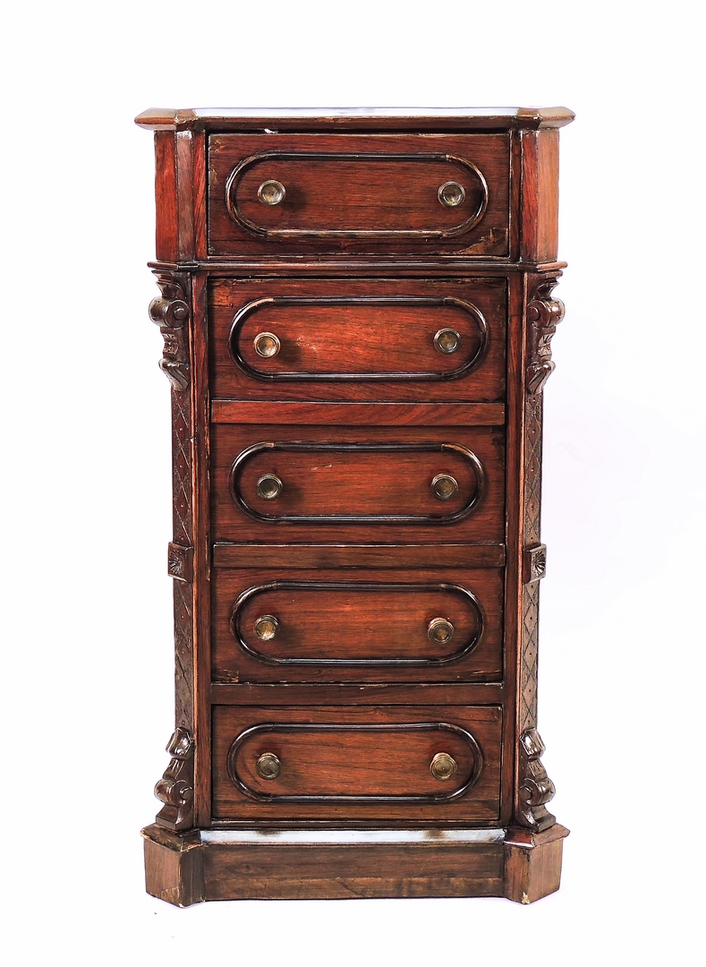 COMODINO IN NOCE - WALNUT NIGHT TABLE XIX secolo - 19th Century piano sagomato, due cassetti sul pronte dritto ed uno sportello realizzato come quattro finti cassetti, base a cornice h cm 88x46x31
