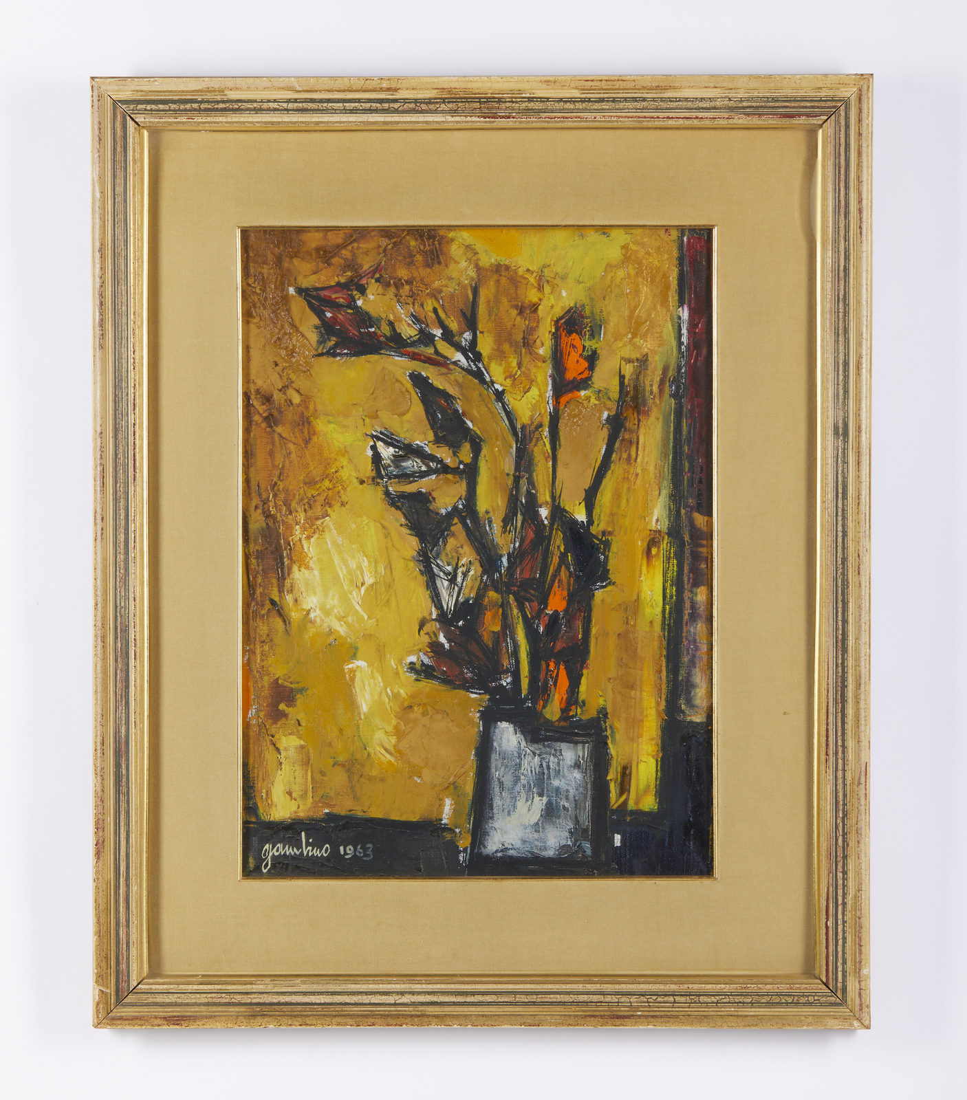 GAMBINO GIUSEPPE (1928 - 1997) Fiori. 1963. Olio su tela . Cm 41,00 x 55,50. Firma e anno in basso a sinistra. Al retro firma, anno e titolo. Cornice presente