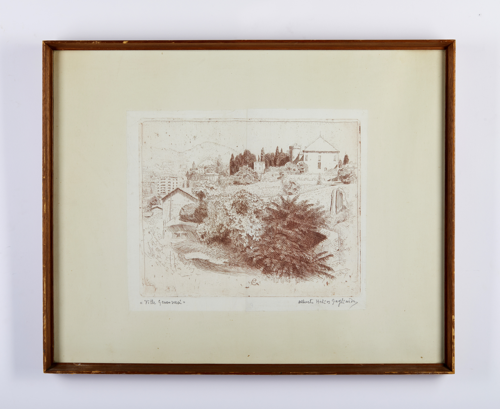 GAGLIARDO ALBERTO HELIOS (1893 - 1987) Ville genovesi. Acquaforte. Cm 36,00 x 30,00. Tiratura non presente. Firma e titolo in basso a matita. Dimensione lastra: 27x33.5 cm. Lievi difetti. Cornice presente