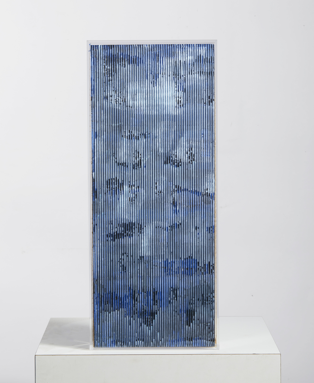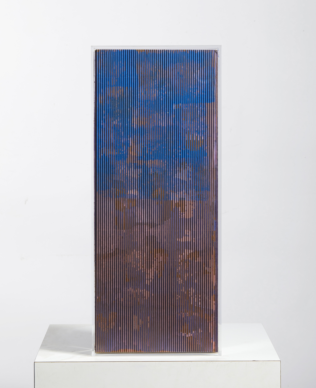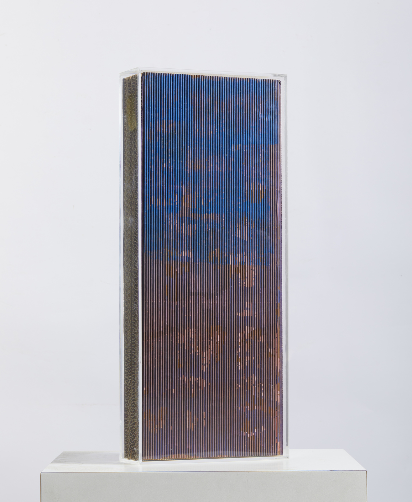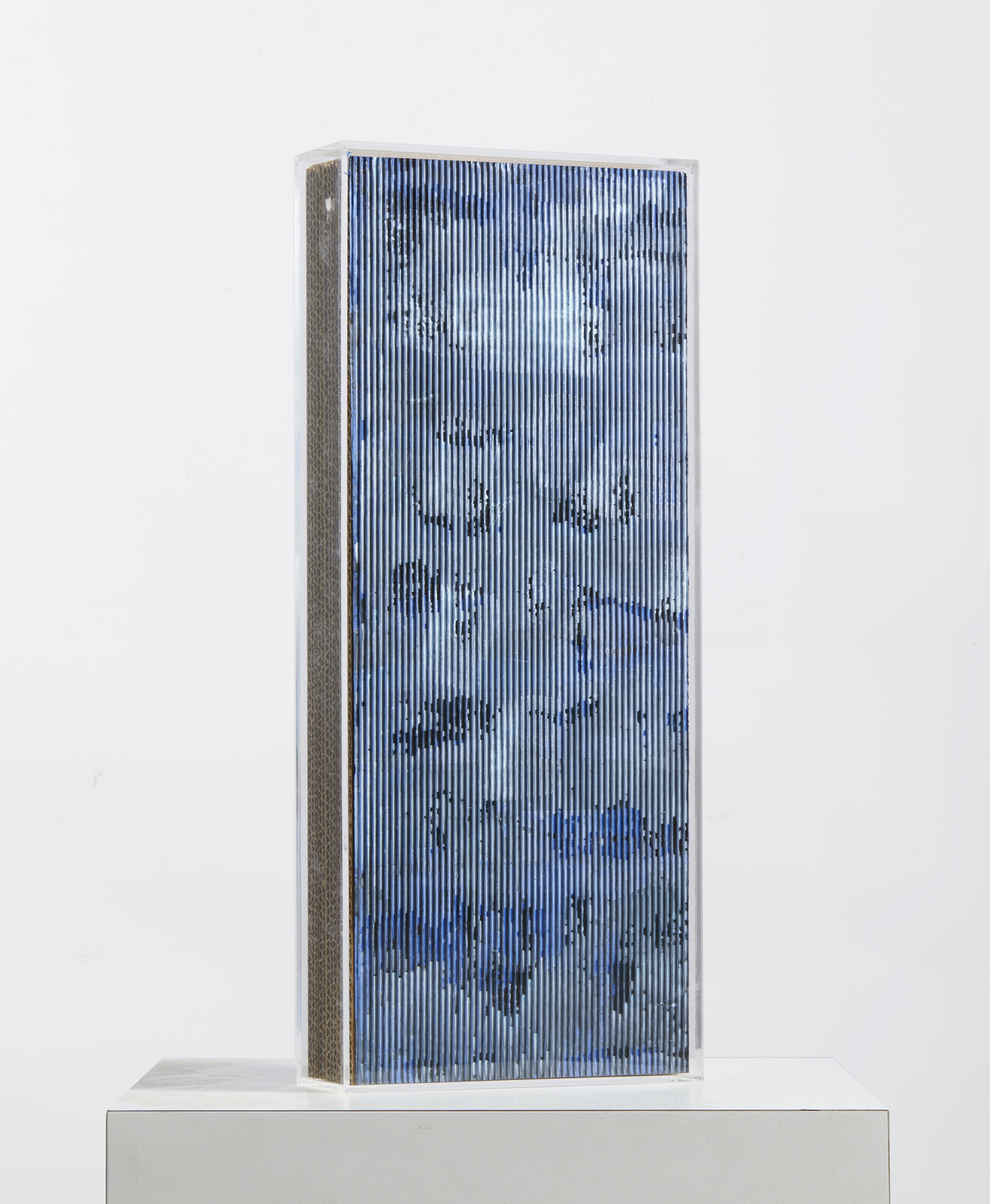 MASI PAOLO (n. 1933) Senza titolo. 2022. Tecnica mista su cartone. Cm 20,00 x 50,00 x 6,00. Opera composta da n.2 parti. Autentica dell'artista su fotografia. Entro teca di plexiglass.