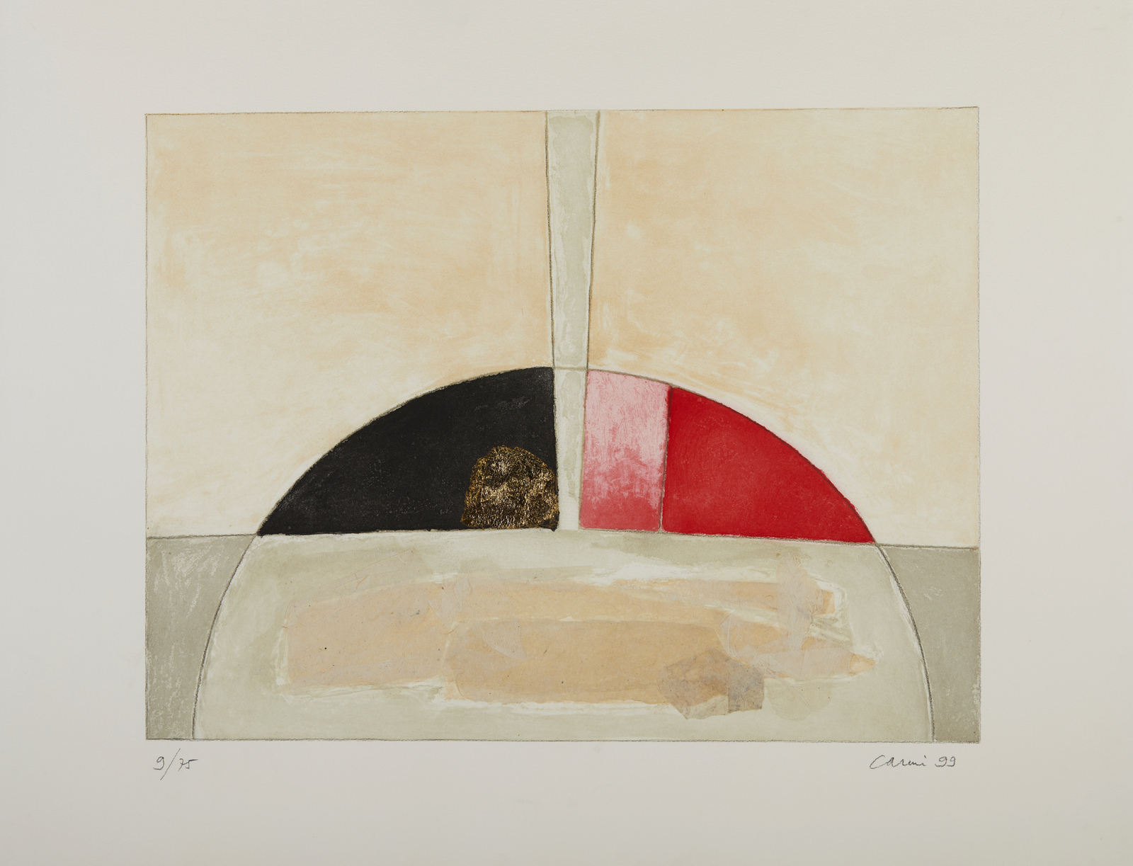 CARMI EUGENIO (1920 - 2016) Senza titolo. 1999. Acquaforte, acquatinta e collage. Cm 80,50 x 65,00. 9/75. Tiratura, firma e anno in basso a matita. Timbro a secco Stamperia Berardinelli, Verona, in basso a destra. Carta Arches Aquarelle. Dimensione lastra: 44x58 cm. Lievi difetti.