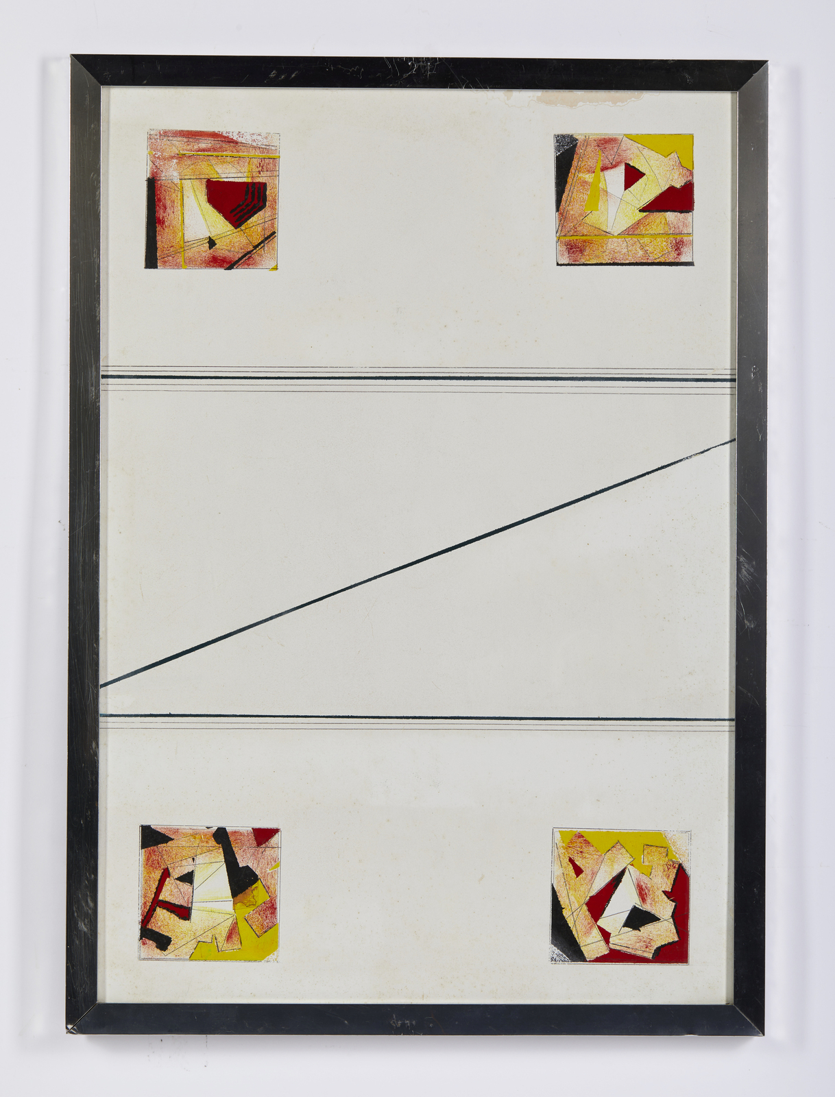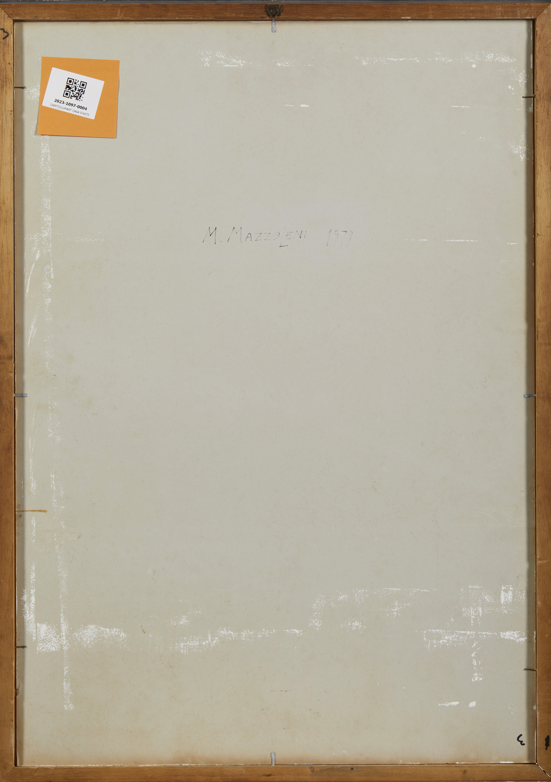 MAZZOLENI MARTINO (1935 - 1995) Emblematica dell'immagine. 1979. Tecnica mista su cartoncino. Cm 49,50 x 71,50. Al retro firma e anno. Dichiarazione di autenticità di Musetti Antonio (dimensioni errate). Difetti. Cornice presente