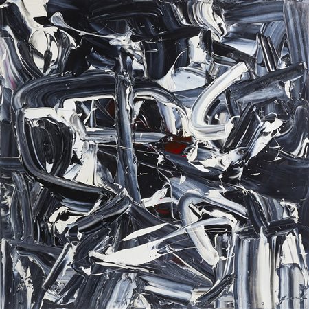 DE LUTTI PIERLUIGI (n. 1959) Il grande viaggio. Olio su tela . Cm 100,00 x 100,00. Firma in basso a destra. Al retro firma e titolo. Autentica dell'artista su fotografia.