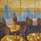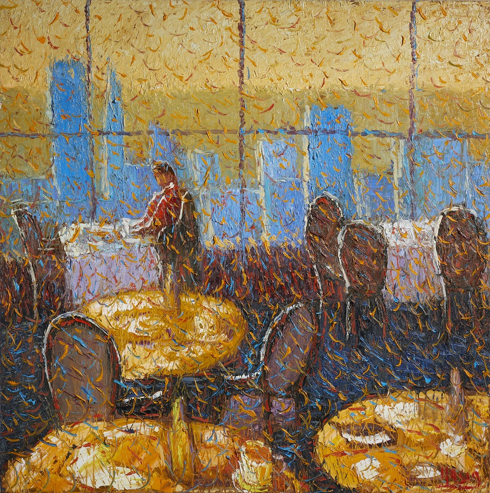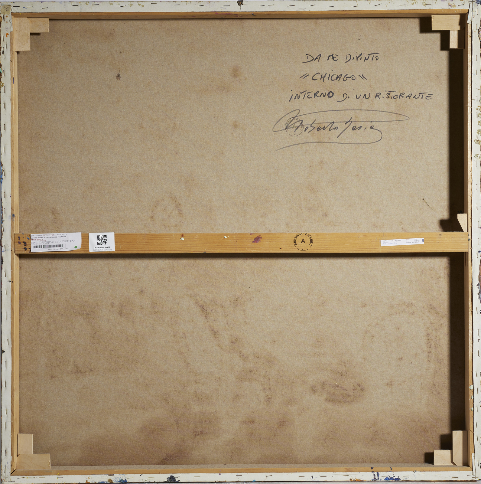 MASIA ROBERTO (n. 1958) Chicago, interno di un ristorante. Olio su tela . Cm 100,00 x 100,00 x 4,50. Firma in basso a destra. Al retro titolo, firma e timbri Galleria Arkadhia, Palermo. Certificato di provenienza Meeting Art, Vercelli. Lievi difetti.