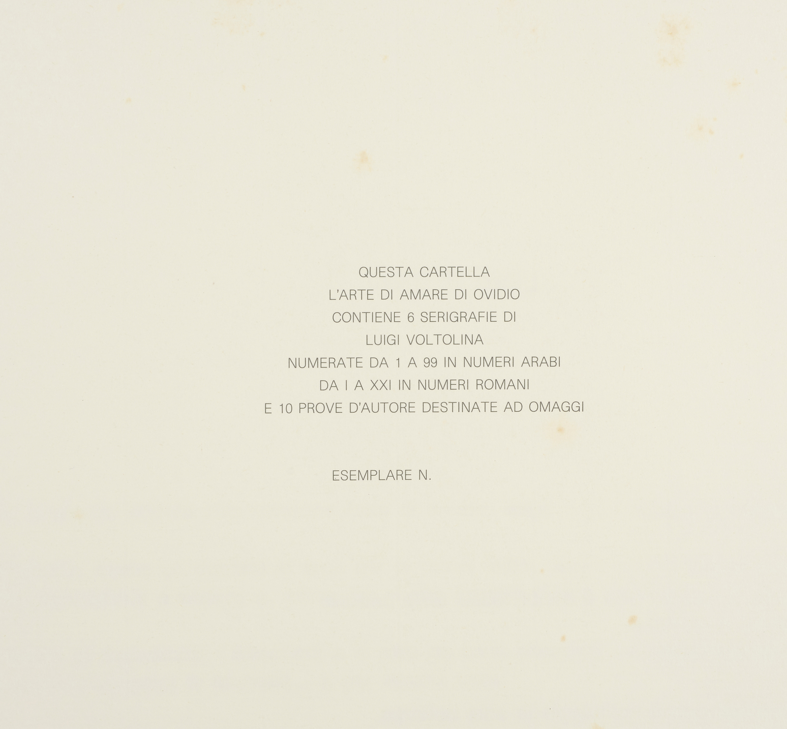 VOLTOLINA LUIGI (n. 1942) Ovidio. L'arte di amare. Consigli agli uomini. Serigrafia (cartella completa). Cm 32,80 x 48,50. 2/99. Tiratura e firma in basso a matita in ciascun foglio. Libro I e II. Consigli alle Fanciulle. Cartella completa composta da n. 6 serigrafie. Editore: Biblioteca Cominiana. Edizione totale: 99 esemplari numerati da 1/99 a 99/99 + XXI esemplari numerati da I/XXI a XXI/XXI + 10 p.d.a. Lievi difetti.