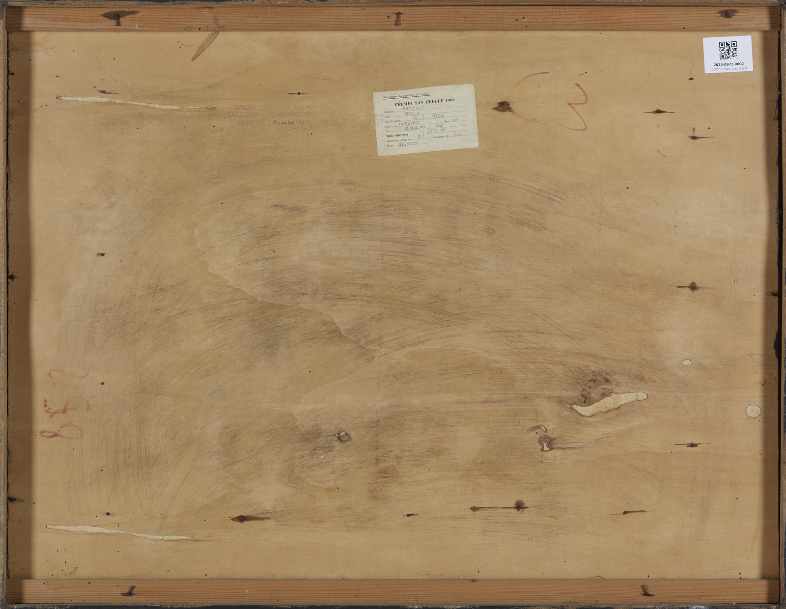 PATELLI PAOLO (n. 1934) Due. 1963. Olio e tecnica mista su tela. Cm 70,00 x 50,00. Al retro cartiglio descrittivo Premio San Fedele 1963. Esposizioni: Galleria del Cavallino, Venezia, Dicembre 1963. Provenienza: Collezione privata, Treviso. Lievi difetti. Cornice presente