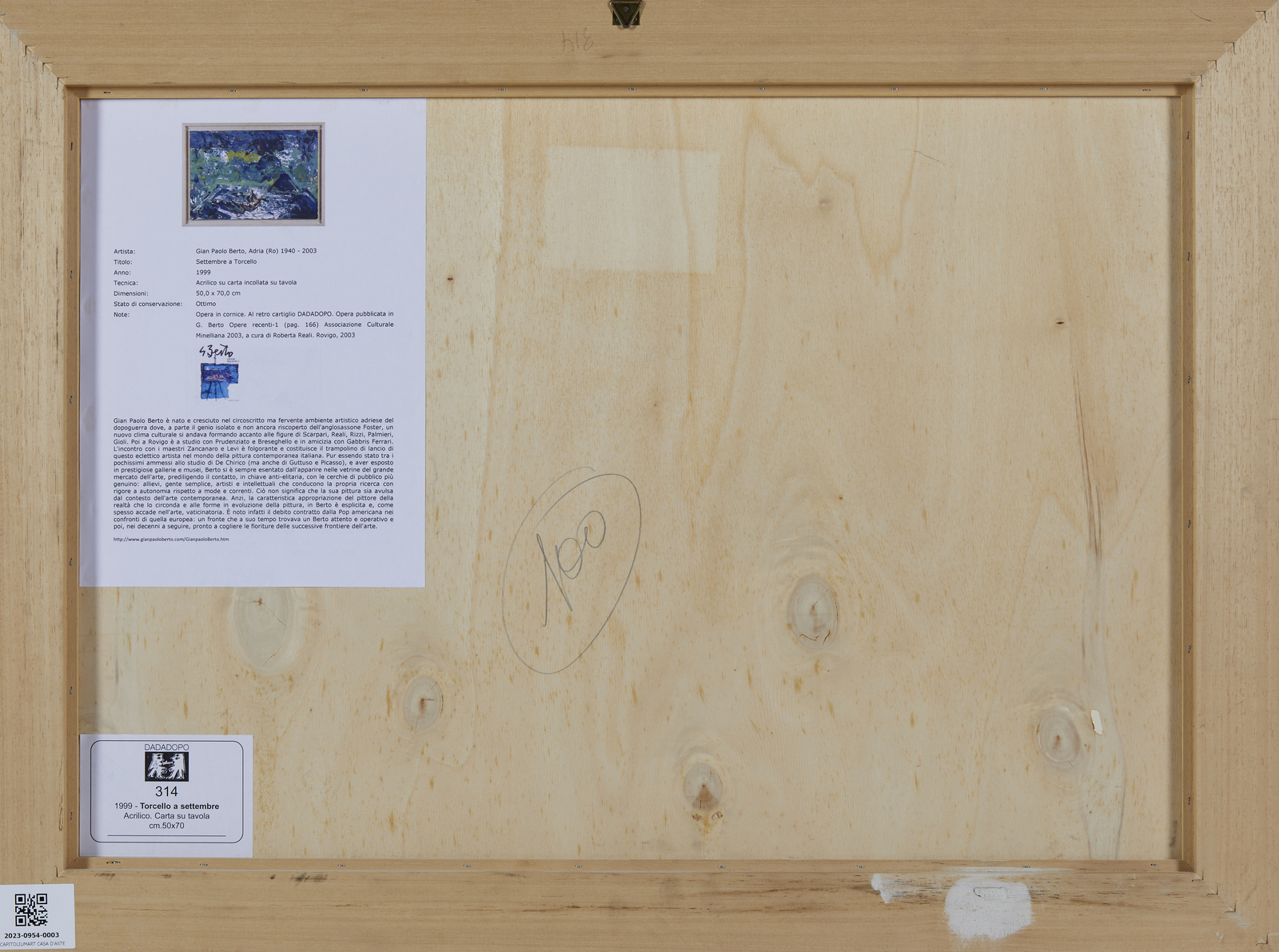 BERTO GIAN PAOLO (n. 1940) Settembre a Torcello. 1999. Acrilico su carta incollata su tavola. Cm 70,00 x 49,50. Al retro cartiglio Dadadopo. Pubblicazioni: G. Berto, Opere recenti 1, a cura di Roberta Reali, Associazione Culturale Minelliana, Rovigo, 2003, p. 166. . Cornice presente