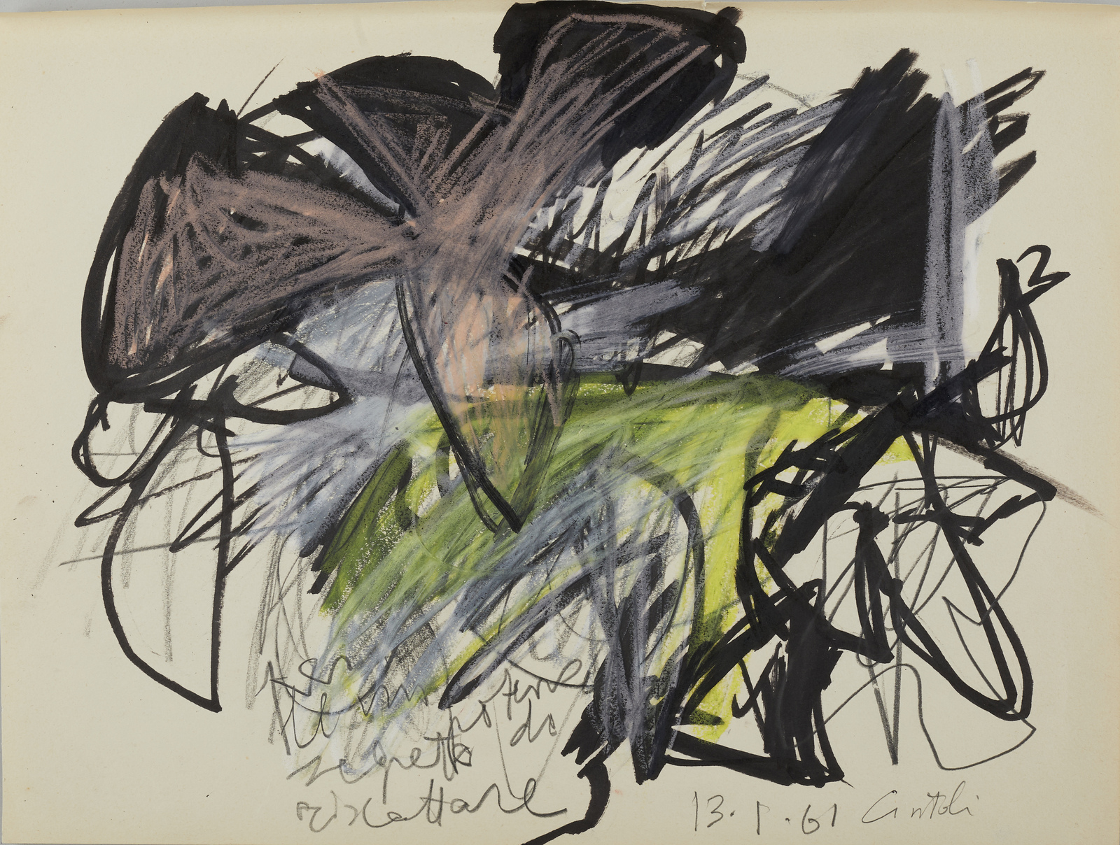 CINTOLI CLAUDIO (1935 - 1978) Senza titolo. 1961. Tecnica mista su cartoncino. Cm 31,50 x 24,50. Firma e anno in basso a destra. Autentica su fotografia di Vittorio Cintoli. Certificato di provenienza Bottega d'arte Lacerba, Ferrara. Lievi difetti.